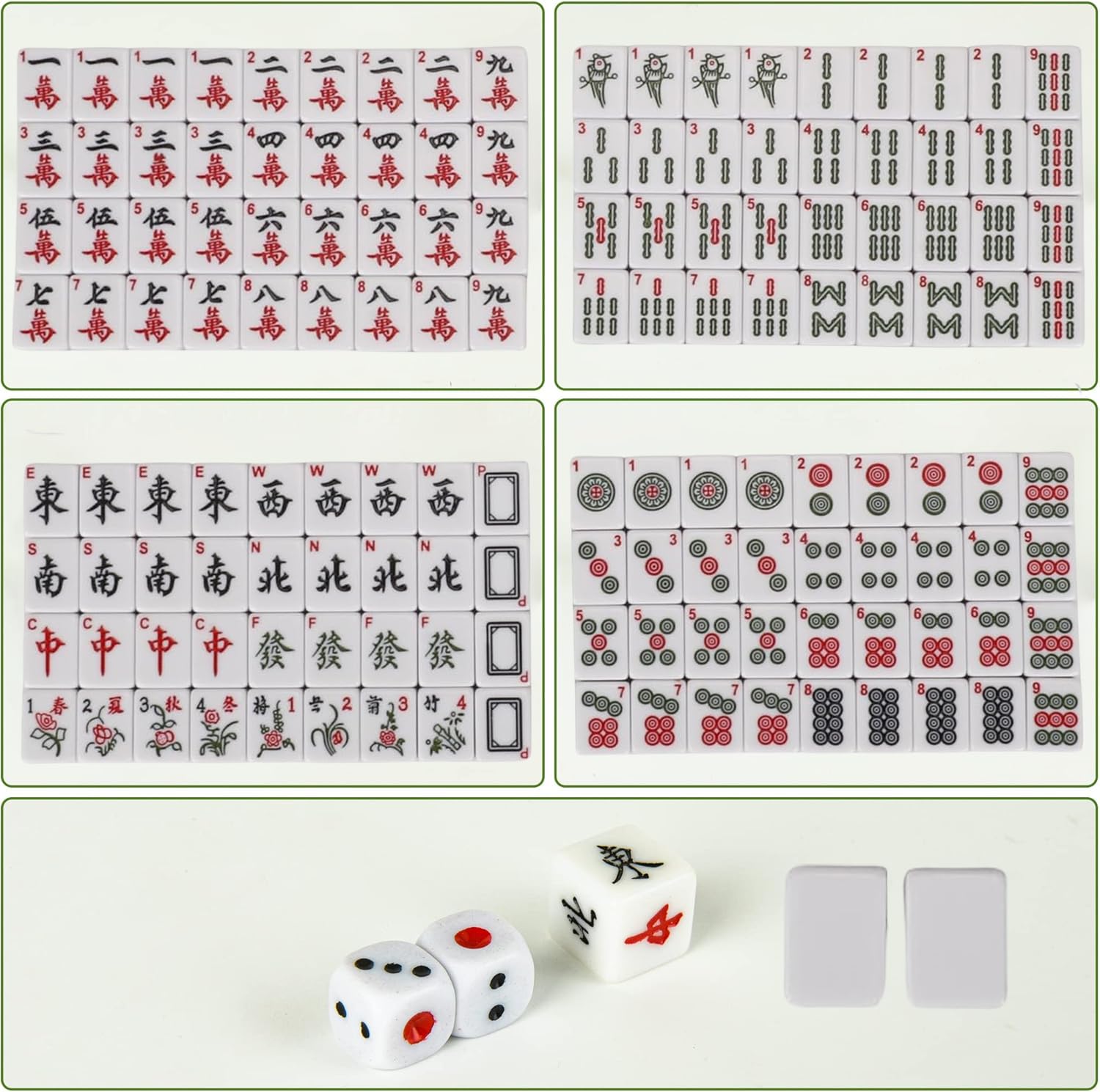- Includes All Tiles: The complete mahjong set Set includes 144 tiles (36 Circles, 36 Bamboos, 36 Characters, 12 Dragons, 16 Winds, 8 Flowers and Seasons) with Arabic numbers and Chinese characters engraved clearly,2 blank spare parts, 3 dice.