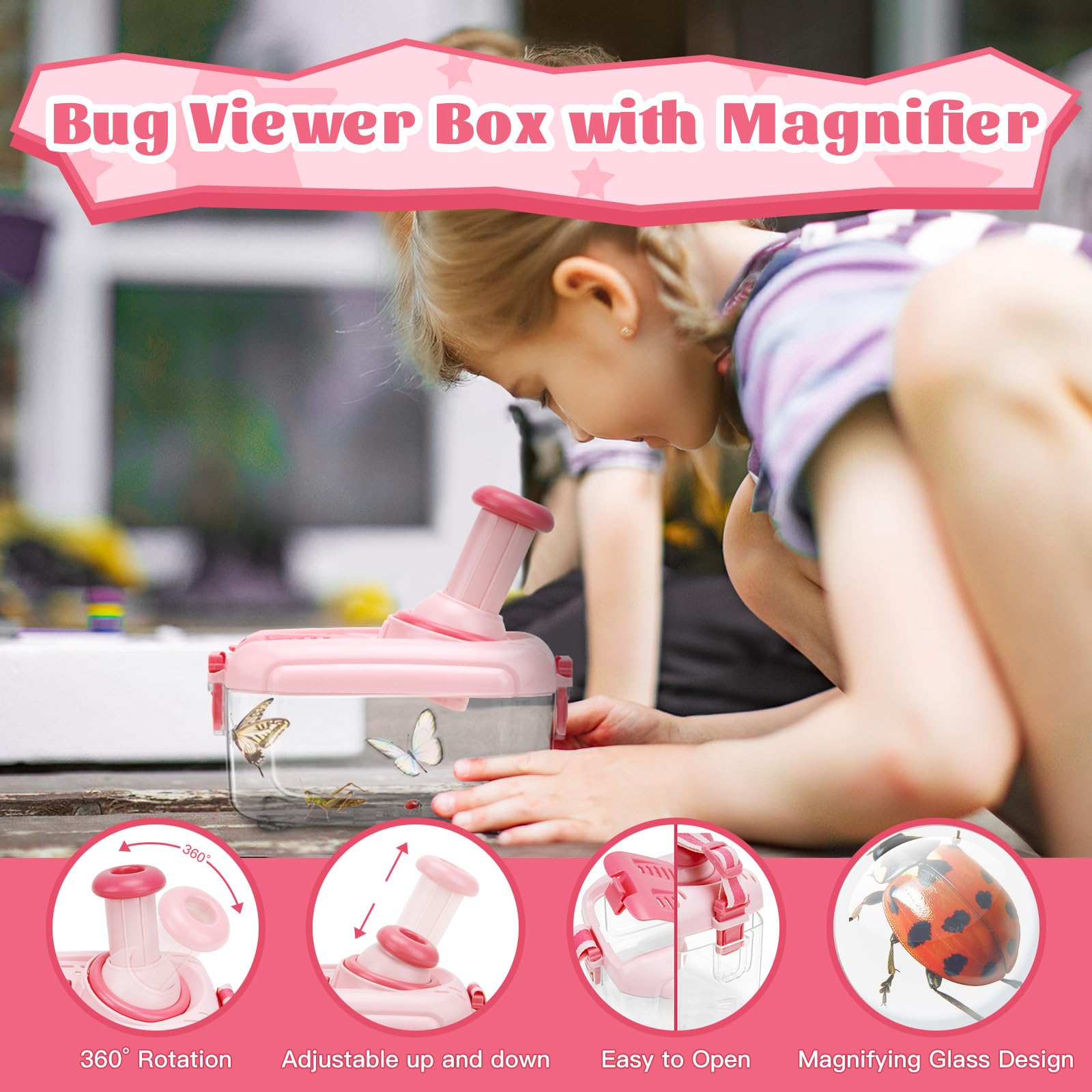 Funsland Bug Hunting Kits for Children – 5 Pcs Kids Bug Catching Kit with 12 Fake Insects, Outdoor Explorer Kit Toys for Toddlers, Educational Toys Gifts for Boys Girls 3 4 5 6 Years Old, Pink