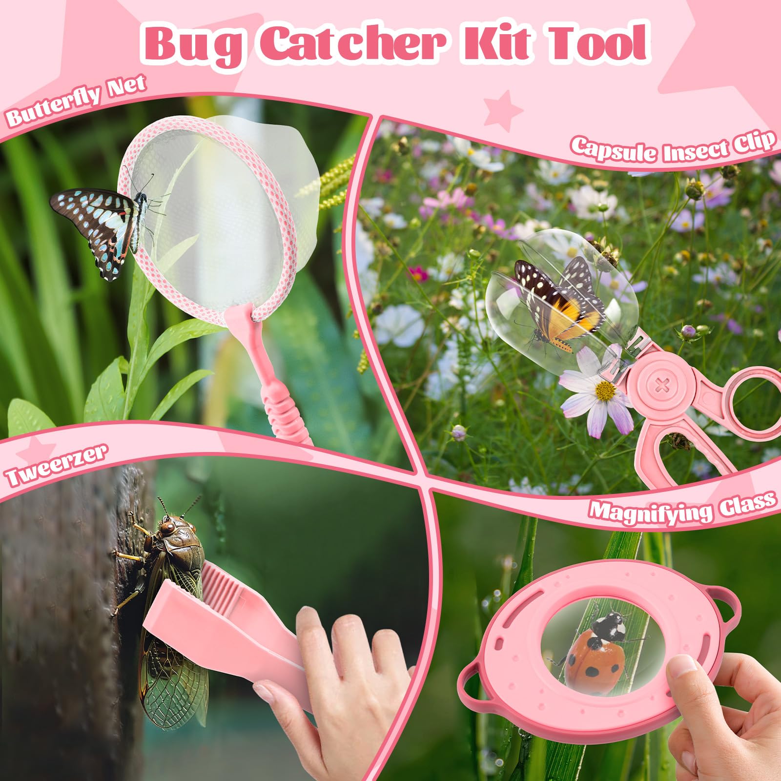- Packaging Includes: 1 Insect box, 1 capsule Insect Clip, 1 pair of tweezers, 1 2x magnifying glass, 1 butterfly net, and 12 plastic insect toys; Small explorers can use it to capture butterflies, grasshoppers, and other small animals