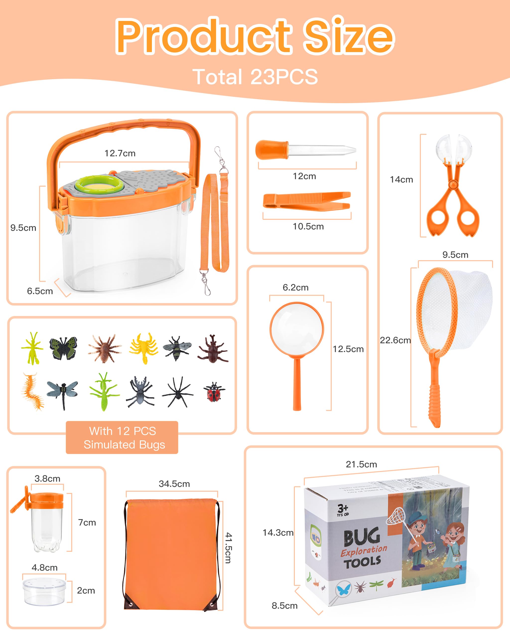 - Complete 23 PCS Bug Catching Set Contains 7 tools including magnifying function insect containers, insect clips, butterfly nets, suction cups and 12 pcs of imitation insects, as well as other accessories, a total of 23pcs