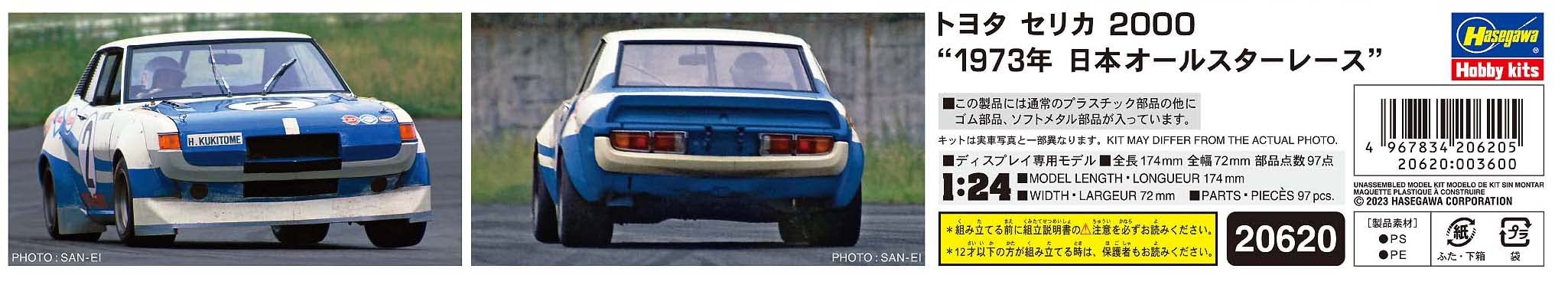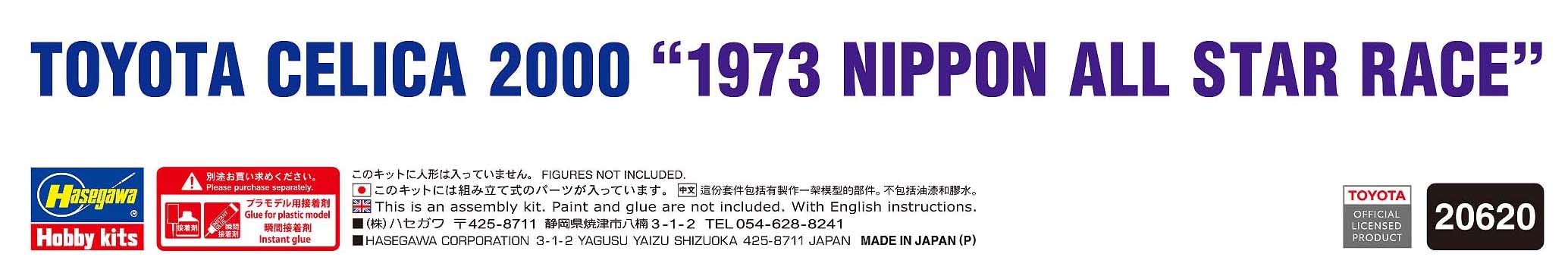 1/24 Toyota Celica 2000, 1973 Nippon All Star Race. Plastic model kit of a Japanese car with 160 pieces, here as a rally version. Decals of the 1973 Nippon All Star Race All Star B Class, No. 2 / Hiroyuki Kukidome. Built length 174 mm / width 72 mm.