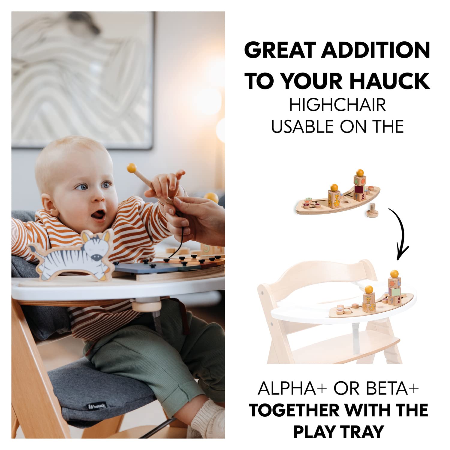 The play tray can be individually combined with up to two hauck play attachments (e.g. bead maze or music toy) that can be bought separately.
