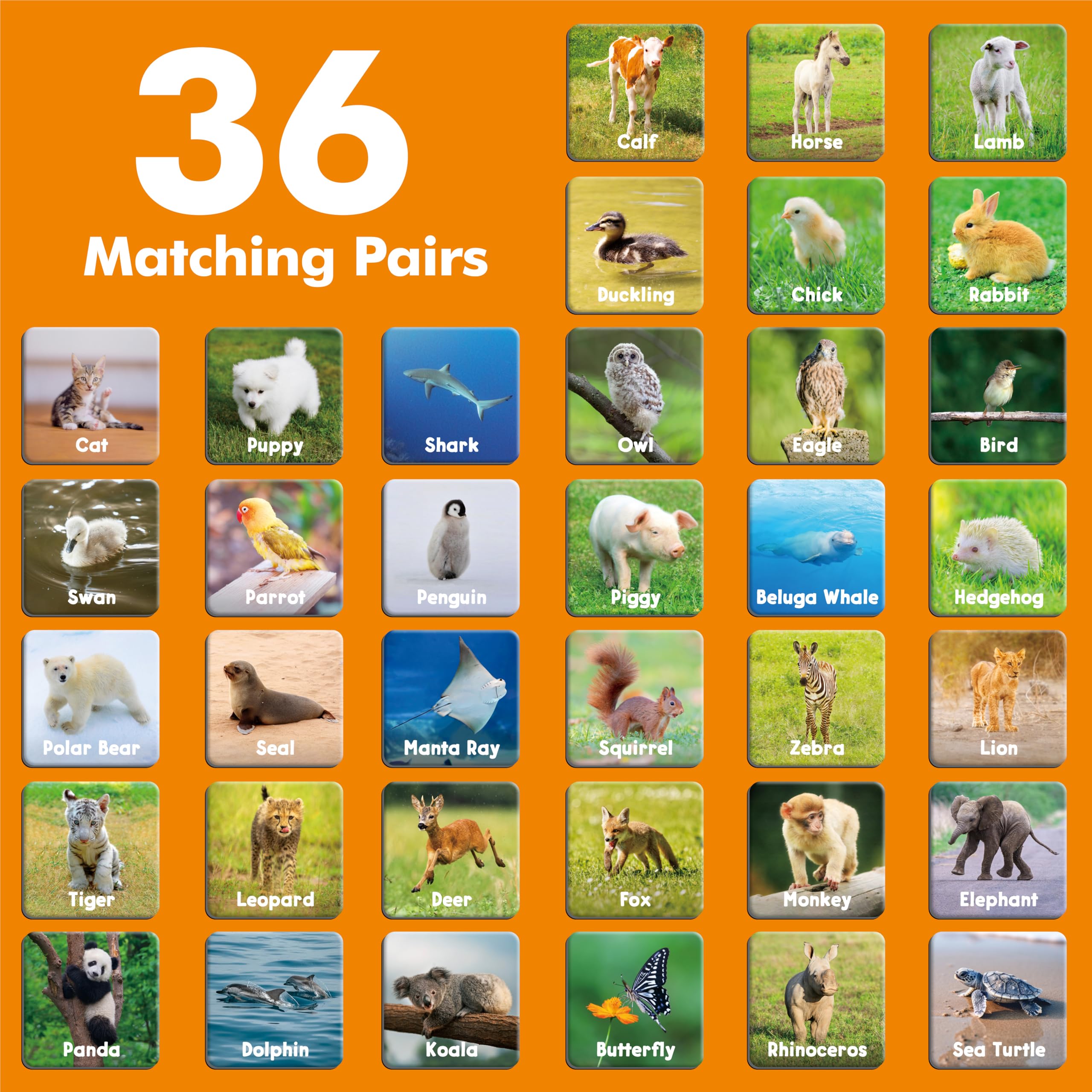 - ATTRACTIVE MATCHING GAME: This animal themed card set is a funny matching game, showing different adorable baby animals, like duck, cat, dog and so on, which will arouse kids curiosity, improve focus and increase memory during the game time. In addition, playing with a group will help enhance the ability of expressing.