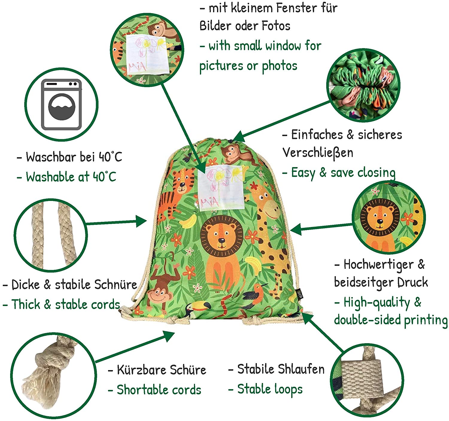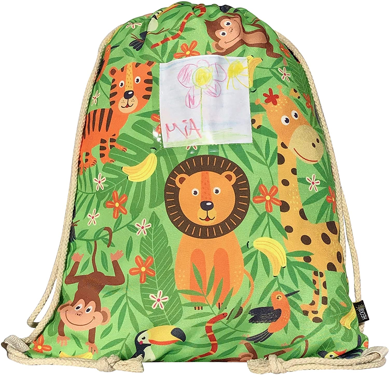 HECKBO® girls kids boys gym bag with window for pictures & photos – jungle – washing machine safe – 12.6″ x 15.8 – kindergarten, travel, sport – backpack, bag, toy bag, gym bag