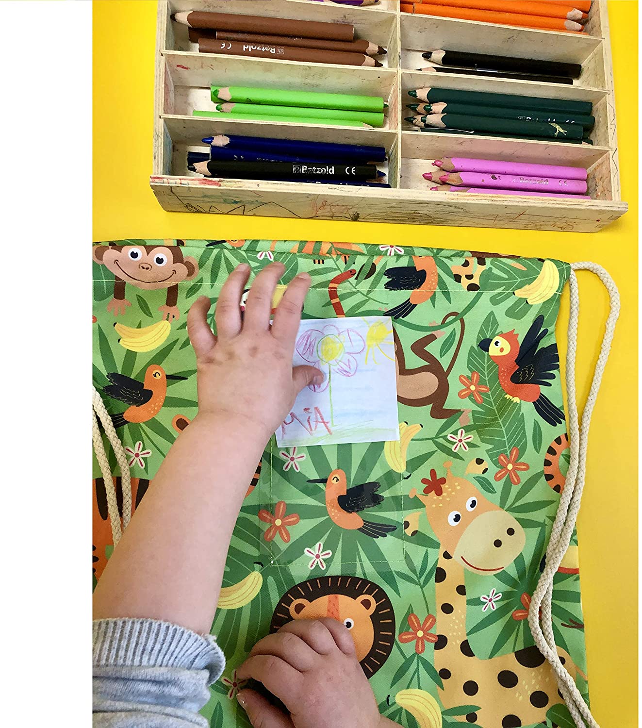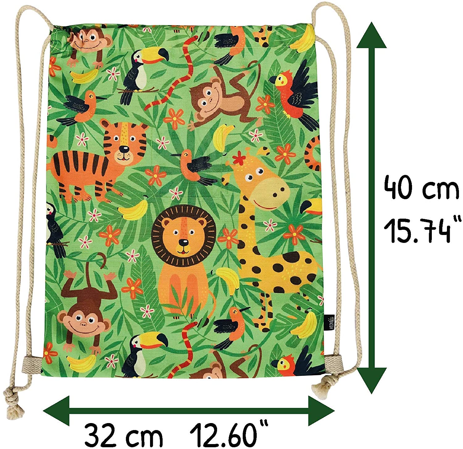 - ► SCOPE OF DELIVERY: 1 jungle gym bag with lion, tiger, giraffe, monkey and parrot; Material: 80% polyester and 20% cotton; Color: green, black, orange, yellow, red, brown; Size: 40x32cm or 12.6″ x 15.8, beige cords (can be shortened)