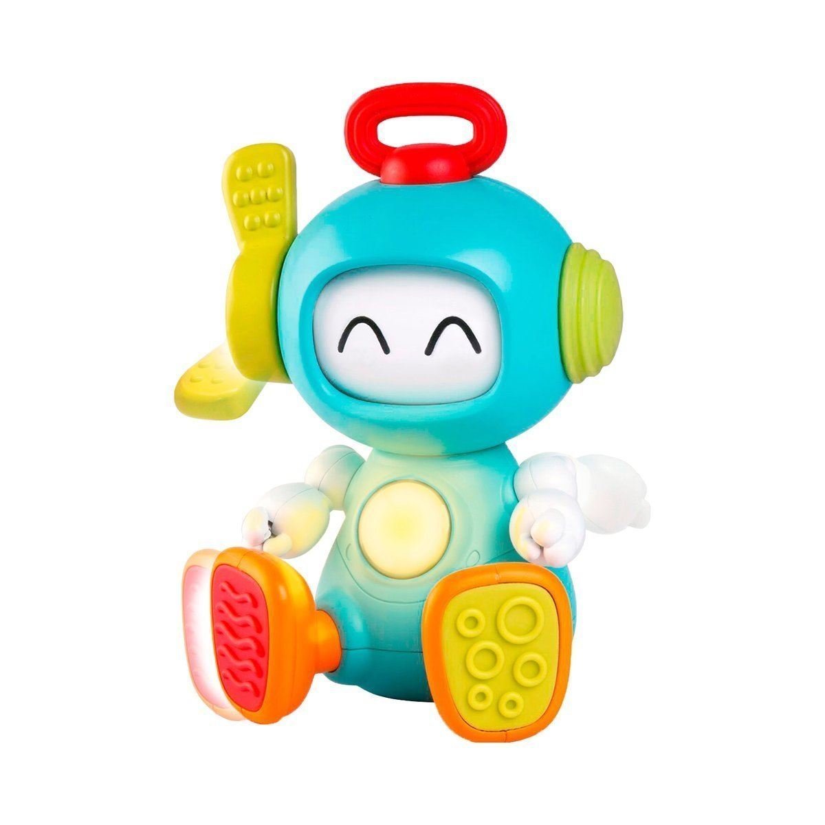 Sounds and music with this funny robot, the head rotates by clicking. by pressing the little handle & his eyes spin for different expressions push one foot in and pull the other out just like the hokey kokey and watch the lights and sounds show , move the arms & more sounds occur . if we were in miami he would be th emiami sound machine … enjoy this awesome award winning toy and play play play . comes in a great open gift box with try me packaging