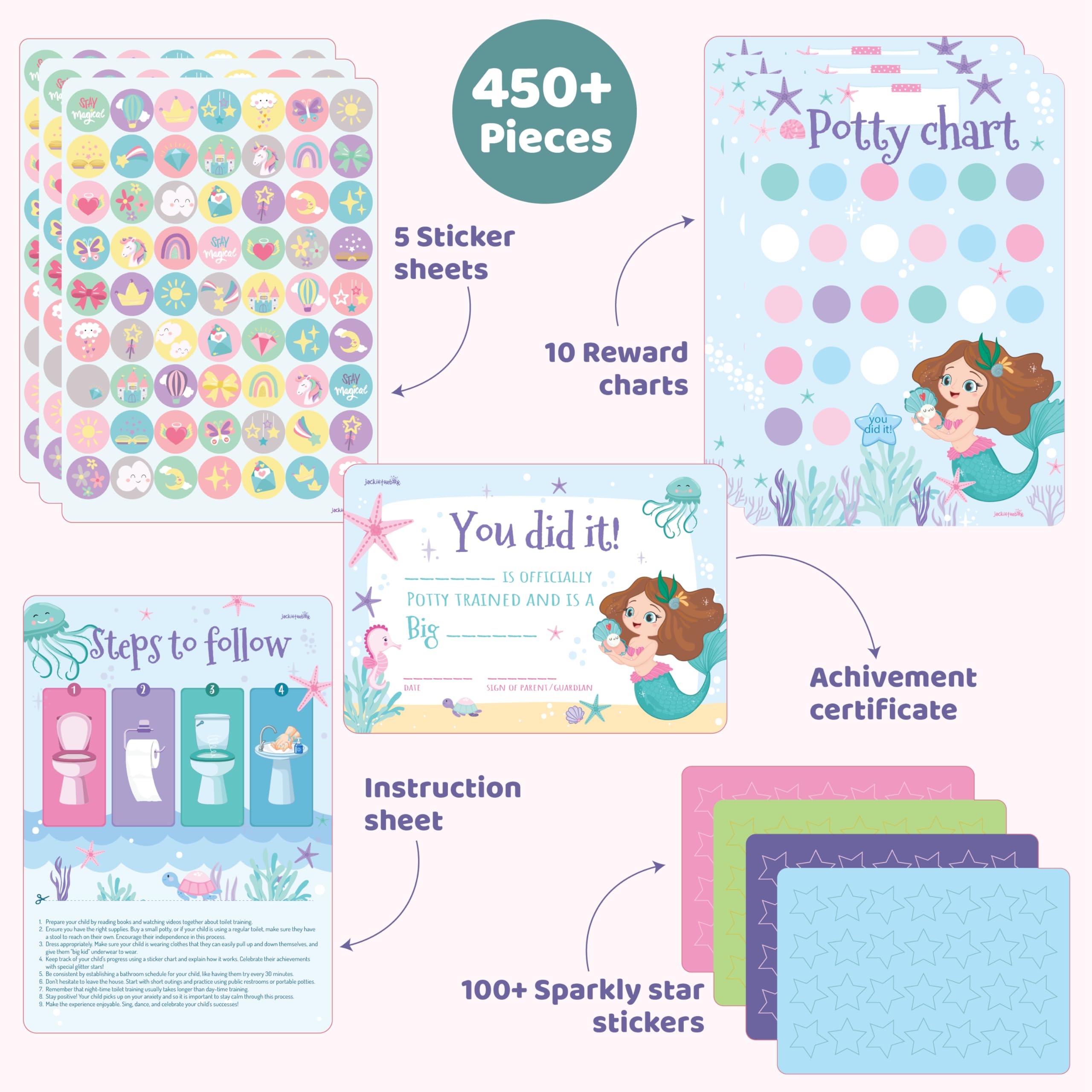 Potty Chart for Toddlers Girls & Boys: This kit contains 10 Potty training chart bases, 300+ Stickers, 100+ Glitter Stars, Achievement Certificate and an Instruction Sheet.