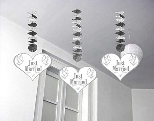 Just Married Hanging Decoration Pack of 3, Silver and White Hanging Decoration with spiral foil and heart