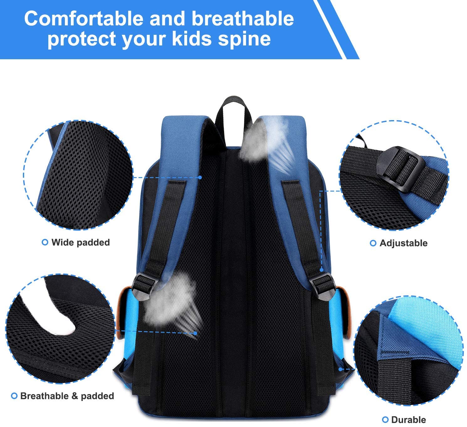 3. Breathable and padded back panel, “S” curve, adjustable, breathable, wide and padded air mesh shoulder straps provide more comfort for little shoulders. Top carry strap for a perfect fit.