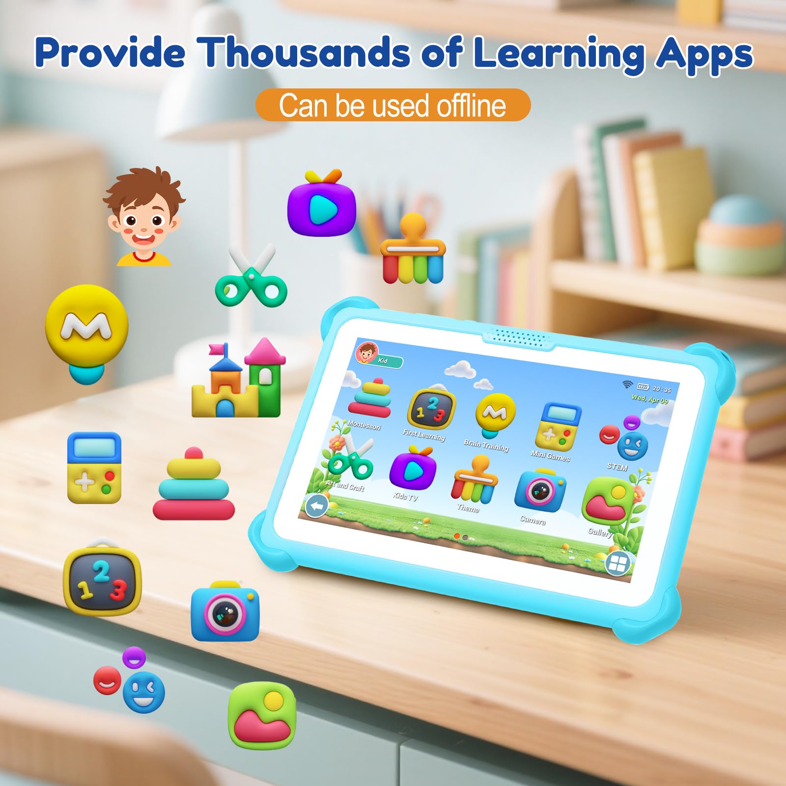 - Tablet with Eye Protective Screen: This 7 inch tablet for kids with quality 1024*600 IPS HD display screen. Clear and bright screen provides better visual experience when kids playing with our children tablet. Automatic brightness adjustment can better protect kids eyes, reduce eye fatigue. Theres a hinged stand on the toddler tablet back that sits at a good angle for play, good to free the hands of your little one too. Warm suggestions: Please kindly keep proper distance for a more comfortable and eye-caring watching experience for our kids learning tablet.