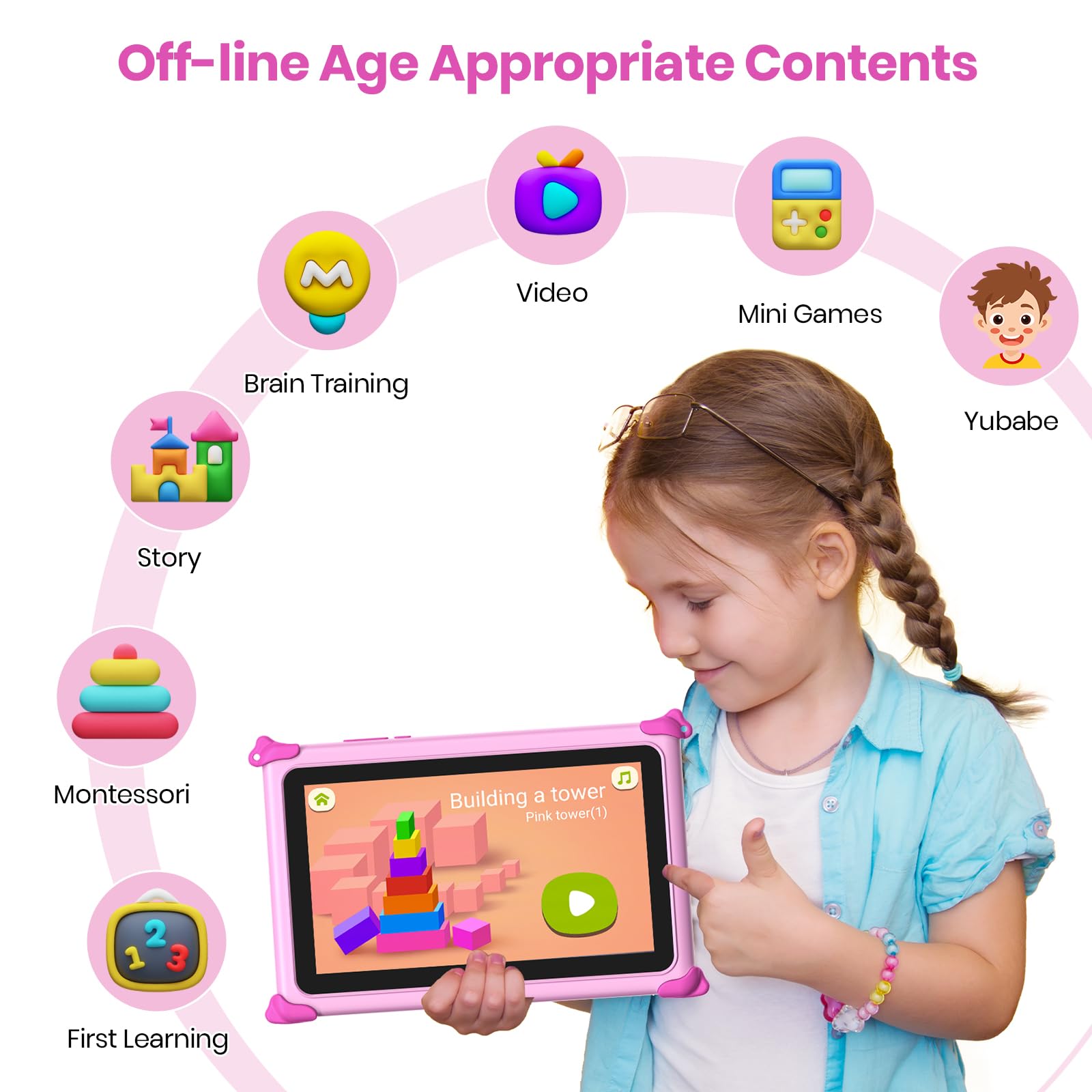 A Great First Tablet for Kids: Topelotek kid’s tablet is special designed for 3-7 years old kids boy, girl. This 7inch kids tablet for toddlers has a lot of built-in kids learning Apps, like Motessori, First learning, Brain training, Mini games, Stem, Art and Craft, Kids TV, many pre-installed apps can be used offline. Parents also can download other apps. Our toddler tablet more interesting than toys, more vivid than books. Child tablet provide kids an interesting, safe, and carefree learning environment. Childrens tablet the preferred partner for child to explore the world wildly. Really the first choice of every toddler.