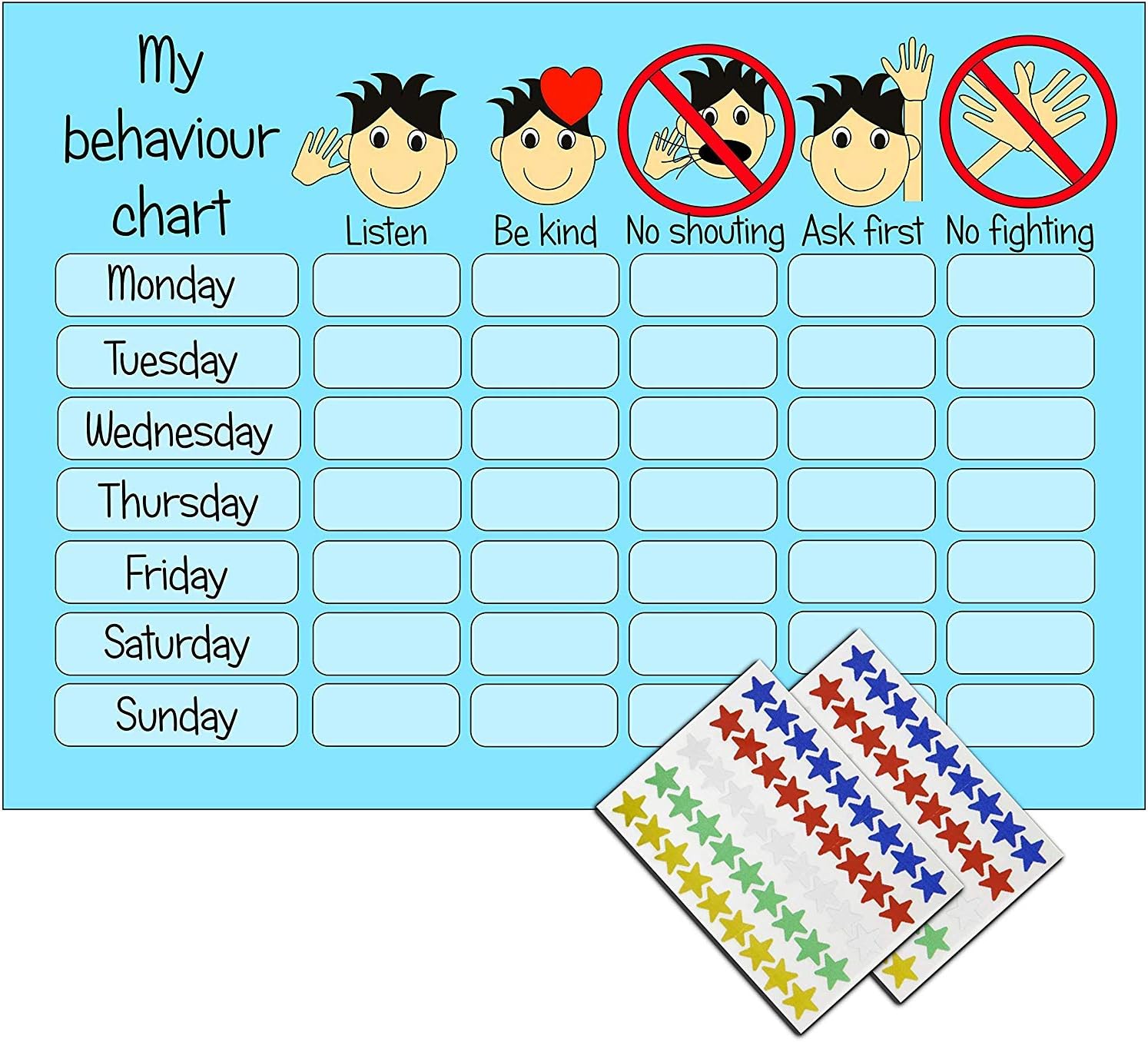 Reward charts are an excellent way of encouraging good behaviour. We’ve design this chart to have five of the most important behaviour problems. Listen, Be Kind, Ask First, No Shouting and No Fighting. You will receive 180 stickers and one blue behaviour chart and one pink behaviour chart. When the child is well behaved let them place a star in the box for that behaviour for the current day of the week.