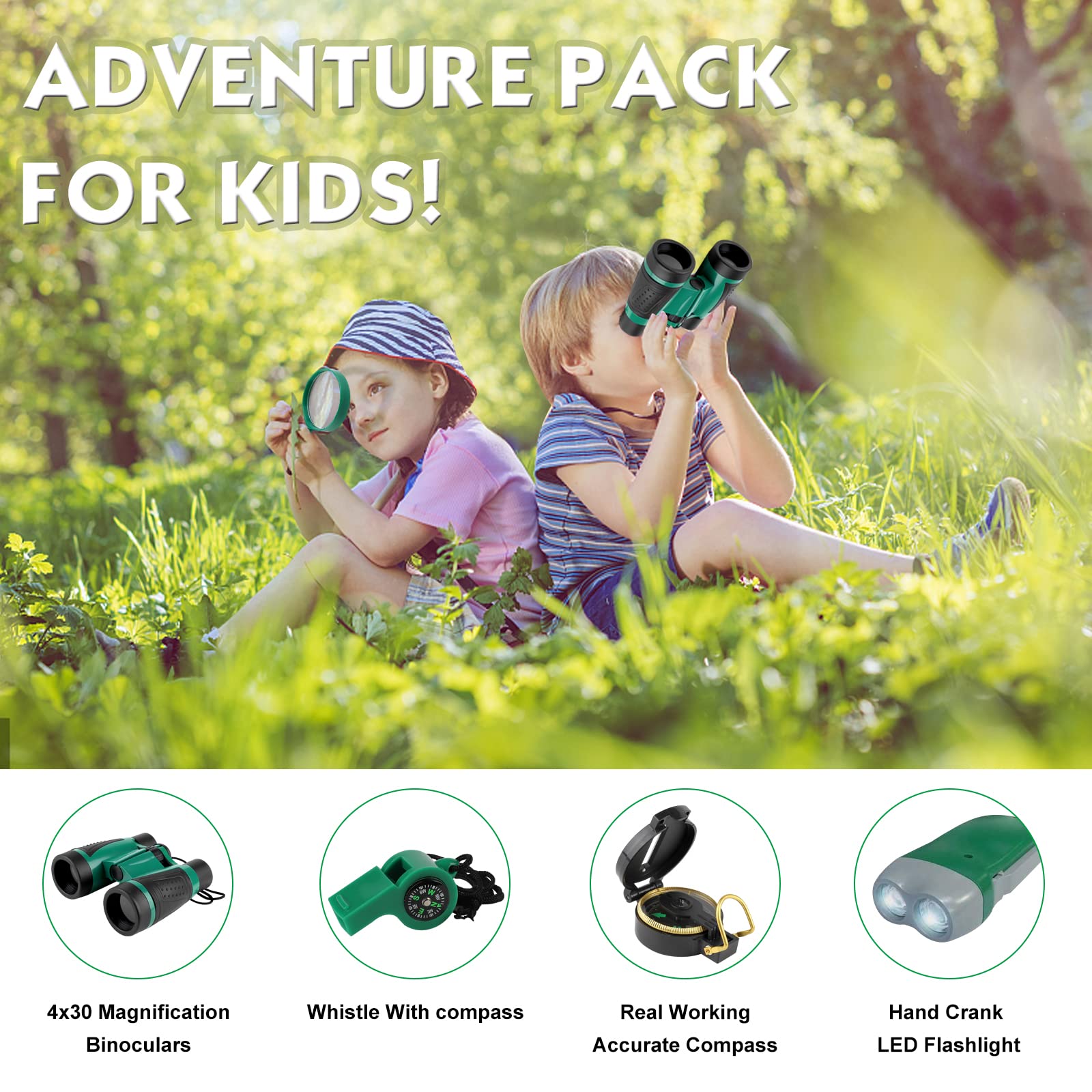 - Discover the World – Encourage a love for nature and exploration. High-quality binoculars help kids observe their surroundings, while the compass teaches them navigation skills. The hand-cranked flashlight extends the excitement into the evening.