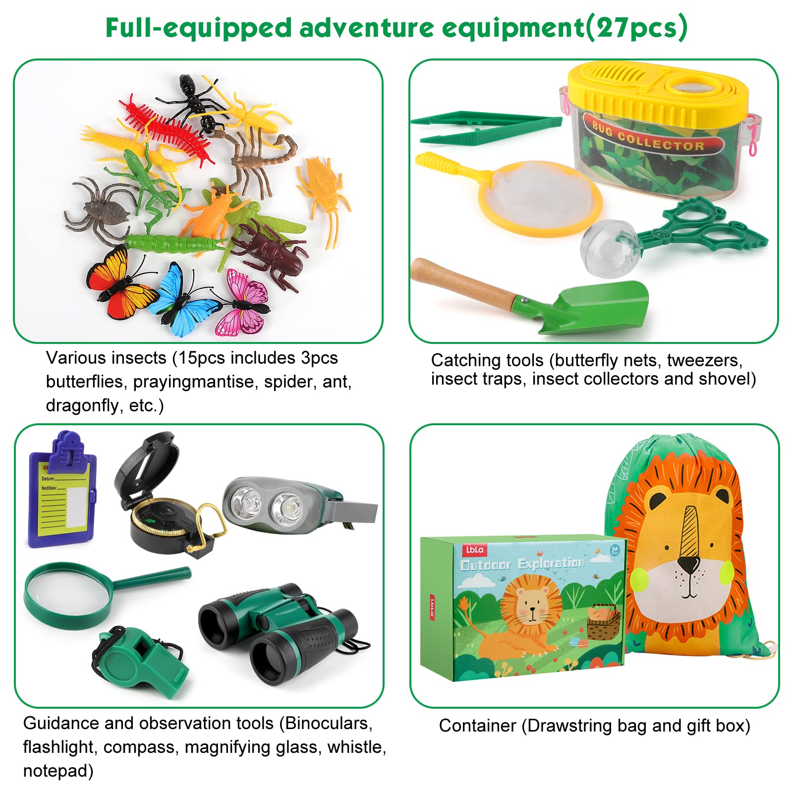 - Complete Exploration Set – Unleash your child’s curiosity with this 27-piece outdoor explorer kit. It includes binoculars, compass, whistle, flashlight, magnifying glass, butterfly net, and more, providing everything young adventurers need.