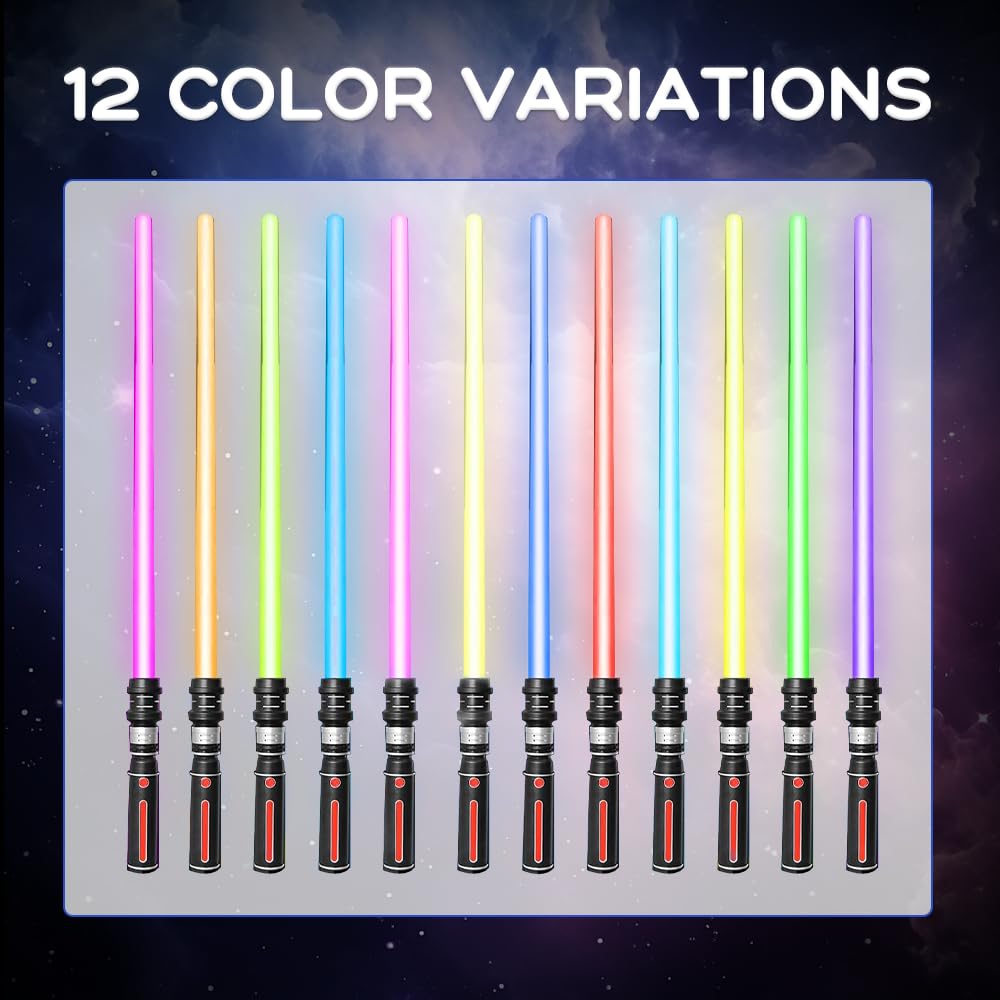 12 COLORS LIGHTSABER: The lightsaber toy has an LED flashing mode. There are 12 colors to switch, the main colors are blue, red and green. The other colors are composed of these three colors, a total of 12 colors. Just press the handle button to switch the color, choose your favorite color to fight. (The lightsaber requires 3 AAA batteries, not included.)