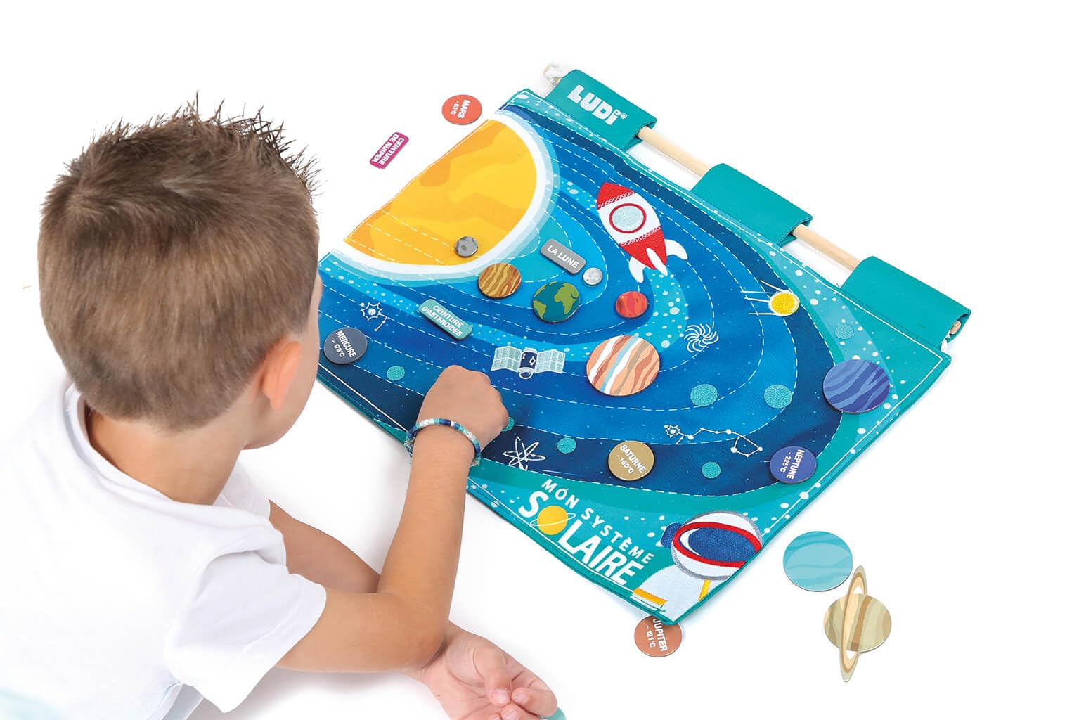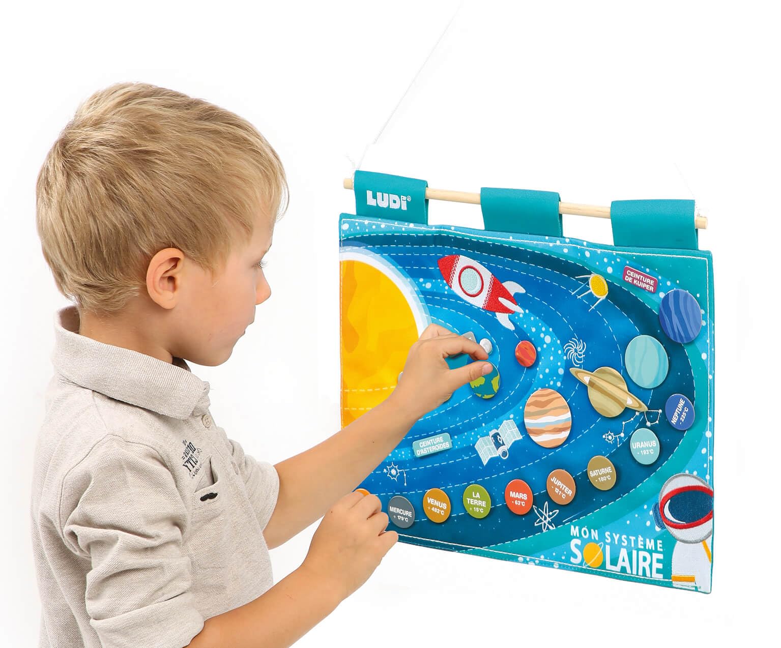 Solar system panel from 5 years: This educational sign allows your child to discover the solar system while having fun with its 21 removable elements, educational sheet included and glow in the dark embroidery at night.
