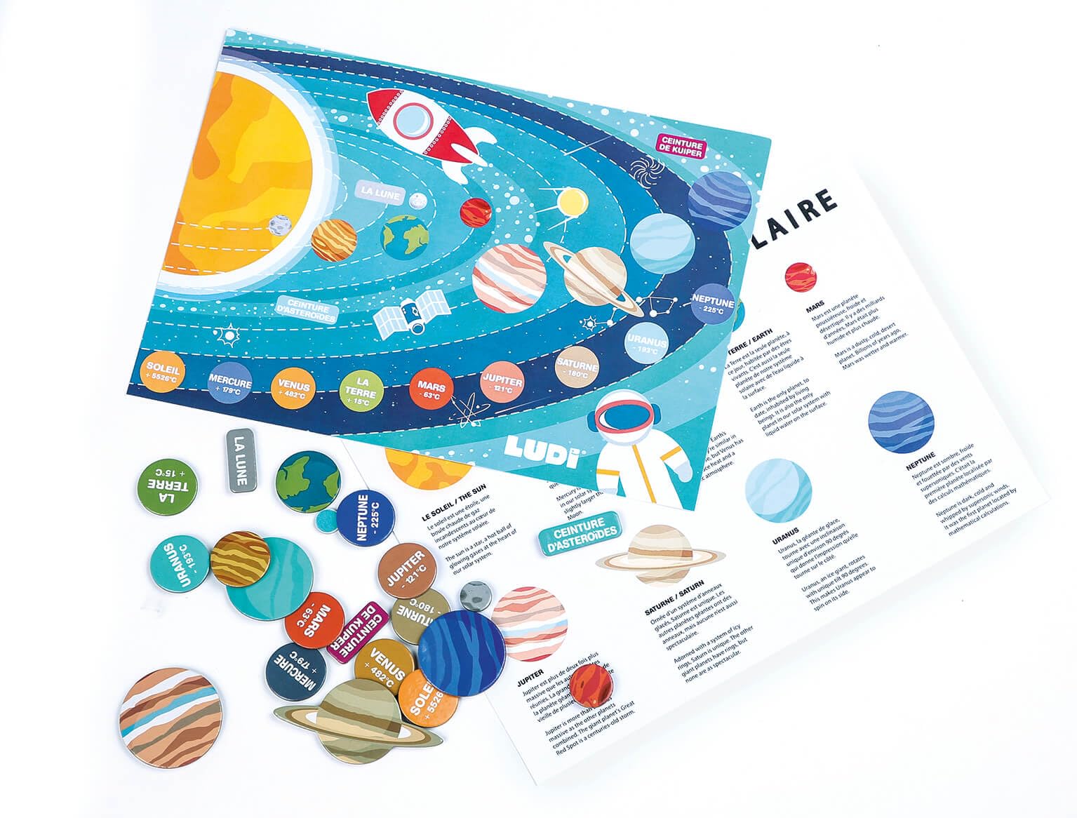 EXPLORE THE UNIVERSE: With this educational toy, your child will be able to discover the planets, their name, their appearance, their location and their climate. The storage pocket allows you to put the different items in it to take them everywhere!