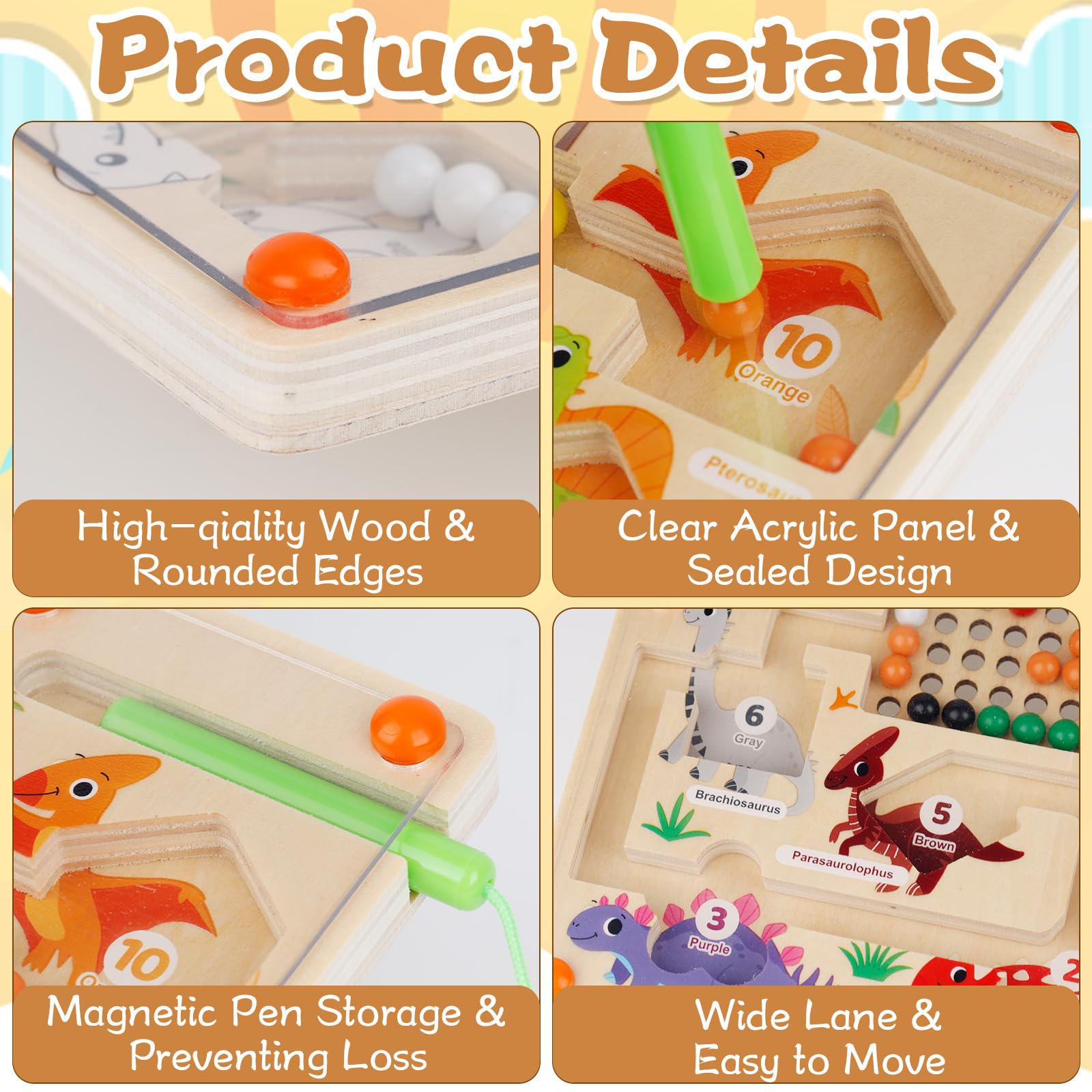 - Funny Magnetic Maze Puzzle Toy: Magnetic maze board has 10 built-in dinosaurs representing numbers 1-10, as well as 55 magnetic beads in 10 bright colors and a magnetic pen. The beads are color-matched to their numbers, perfect for training children’s counting, color recognition, and matching skills and learning more about dinosaurs in a fun way.
