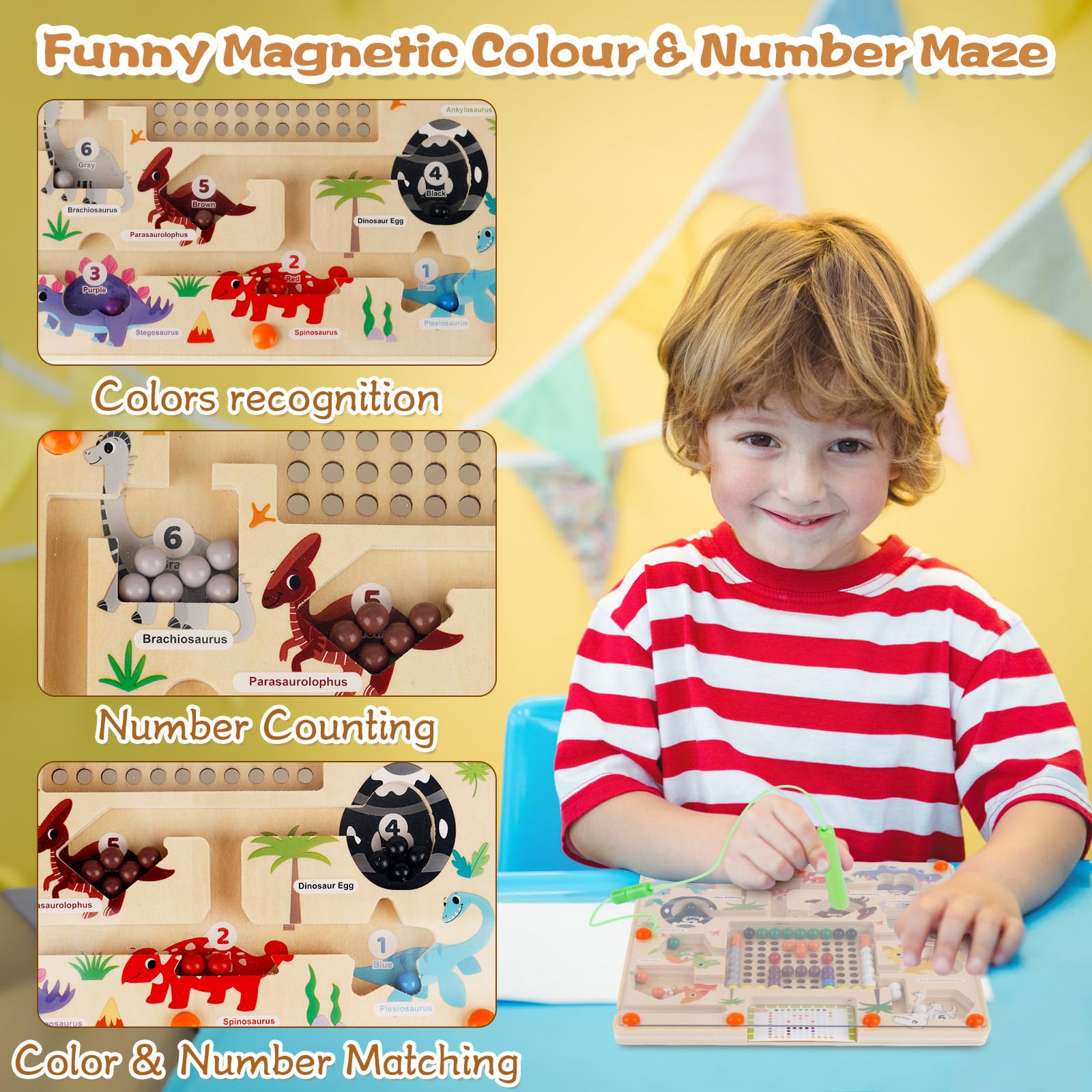 Magnetic Colour and Number Maze, Magnetic Wooden Maze Board Counting Sorting Matching Games, Educational Learning Dinosaur Magnetic Labyrinth Toy for Kids Toddlers Age 3-6