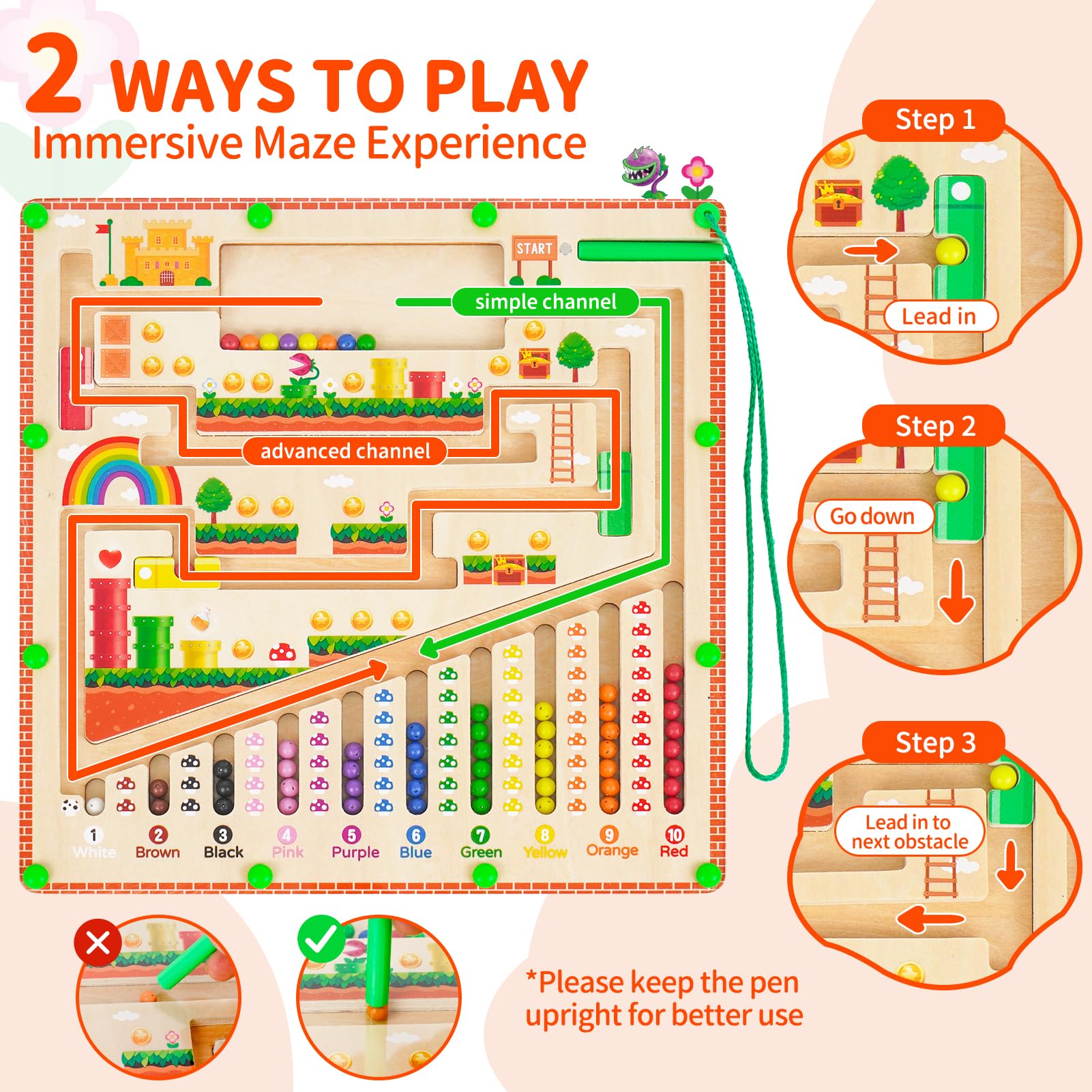 - Multiple Difficulty Levels Our magnetic color and number maze has 2 difficulty levels of play and will never lose its value. Simple play – Use the magnetic wand to easily guide the magnetic beads through the maze from the channel on the right to complete the matching of numbers and colors. Advanced play – Use the magnetic pen to guide the beads from the left maze passage through obstacles to the destination can help children develop problem-solving skills and hand-eye coordination.