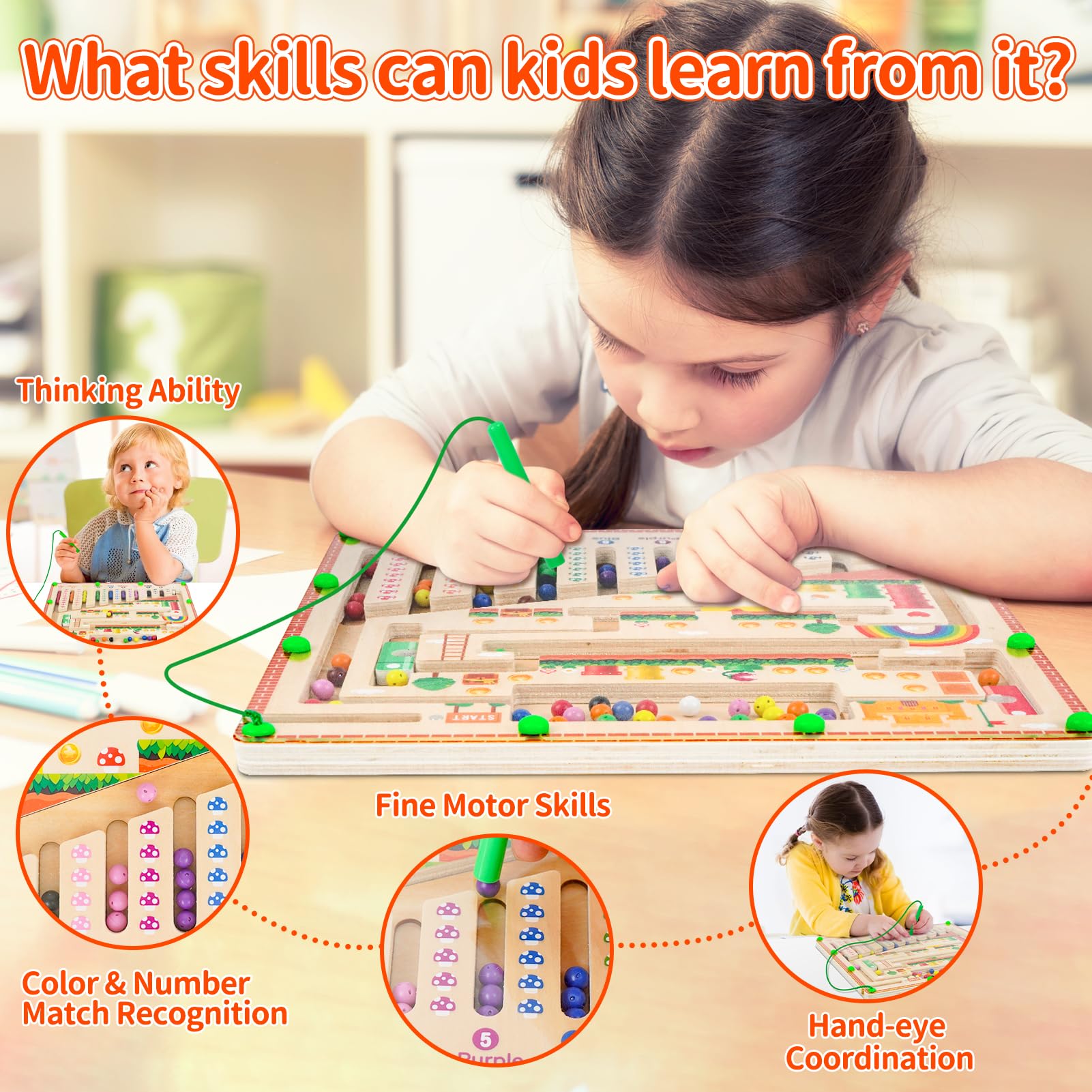 - Preschool Learning Activities The magnet color and counting maze is perfect for learning colors, sorting, number recognition and counting. Wooden kids sensory toys for toddlers can enchance your child’s fine motor skills, counting abilities and color recognition, improve them concentration, patience, attention, hand-eye coordination and independent thinking. This magnetic board as toddler outdoor toys, kids travel essentials, learning toys for toddlers 2-4 years, board games for kids 4-6.