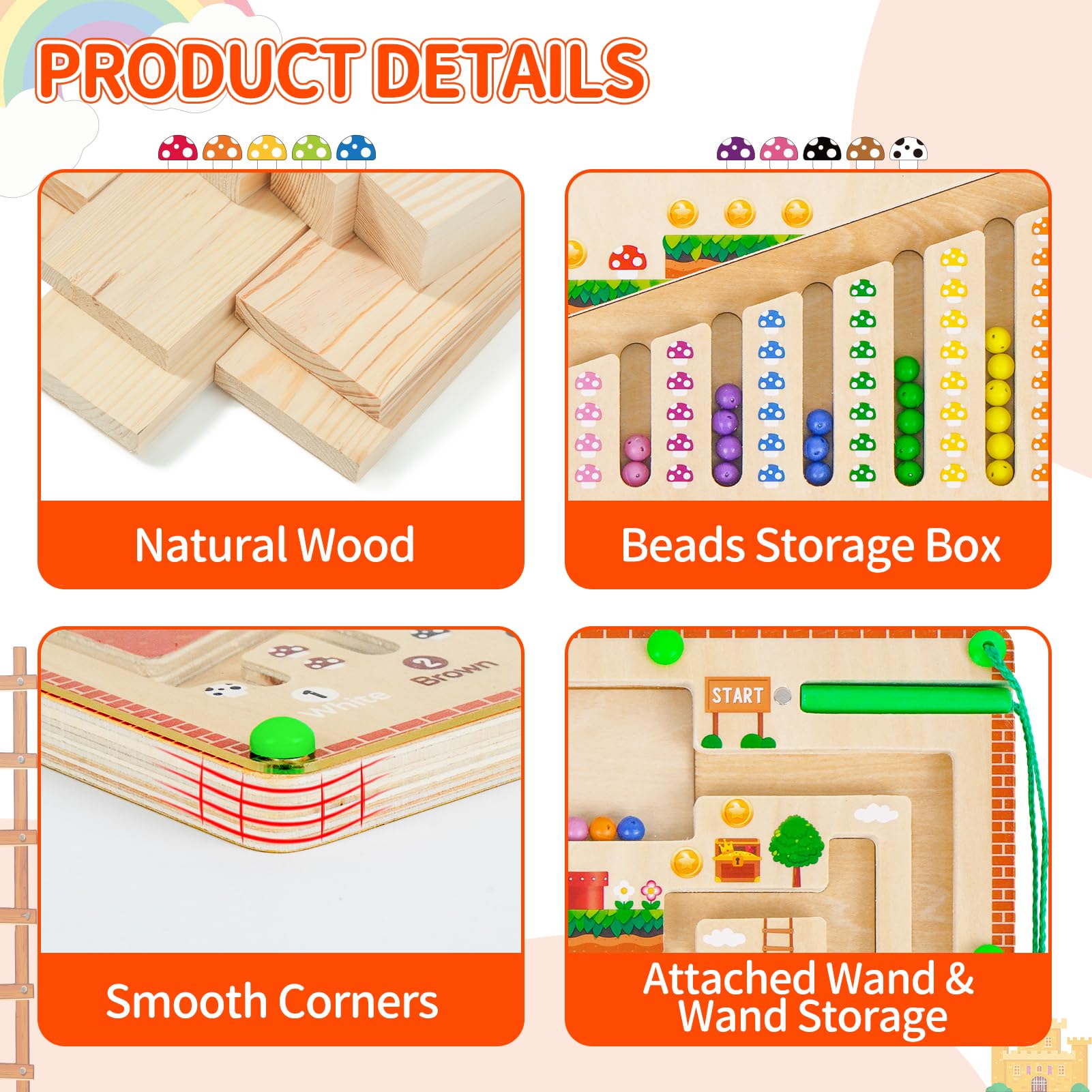 - Child-Friendly Design Our wooden toys busy board is made of high-quality natural wood and non-toxic water-based paint, smooth surface. Our magnetic maze board has a sturdy transparent acrylic plate on the surface, all the beads are firmly sealed in the board and fixed with 12 nails, the balls won’t fall off, which can effectively avoid the risk of baby swallowing. In addition, the magnetic wand is attached to the color sorting toys with a string and will not get lost.