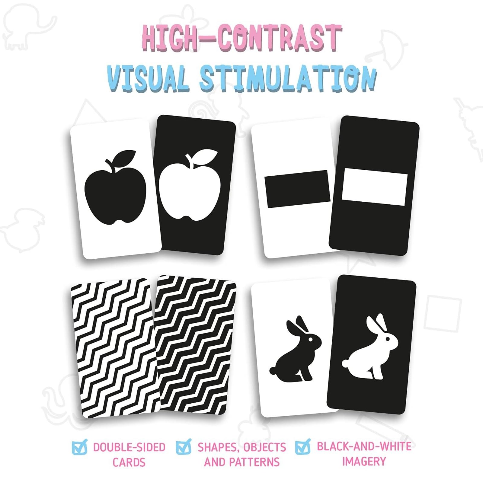 - ENCOURAGE INDEPENDENT PLAY: Black-and-white flashcards are an excellent tool for promoting independent exploration during tummy time or high chair activities. These simple cards provide a visually stimulating and engaging way for wee ones to discover the world around them. As babies gaze at the contrasting black-and-white patterns, they improve their visual tracking skills and develop their cognitive abilities. Parents and caregivers can encourage babies to play and explore on their own.