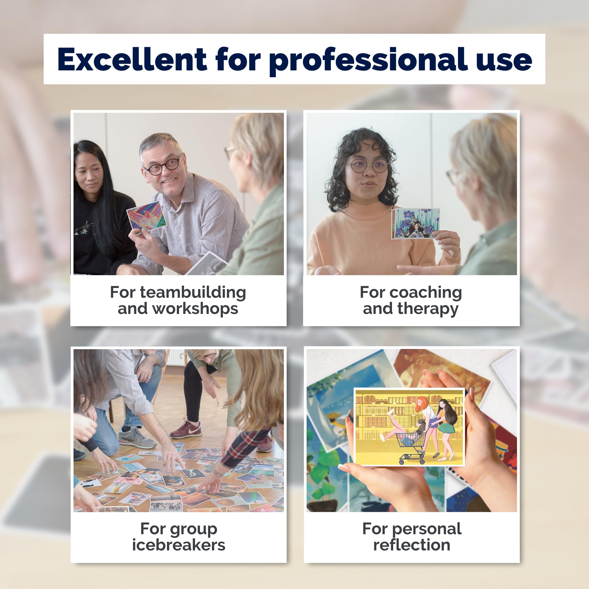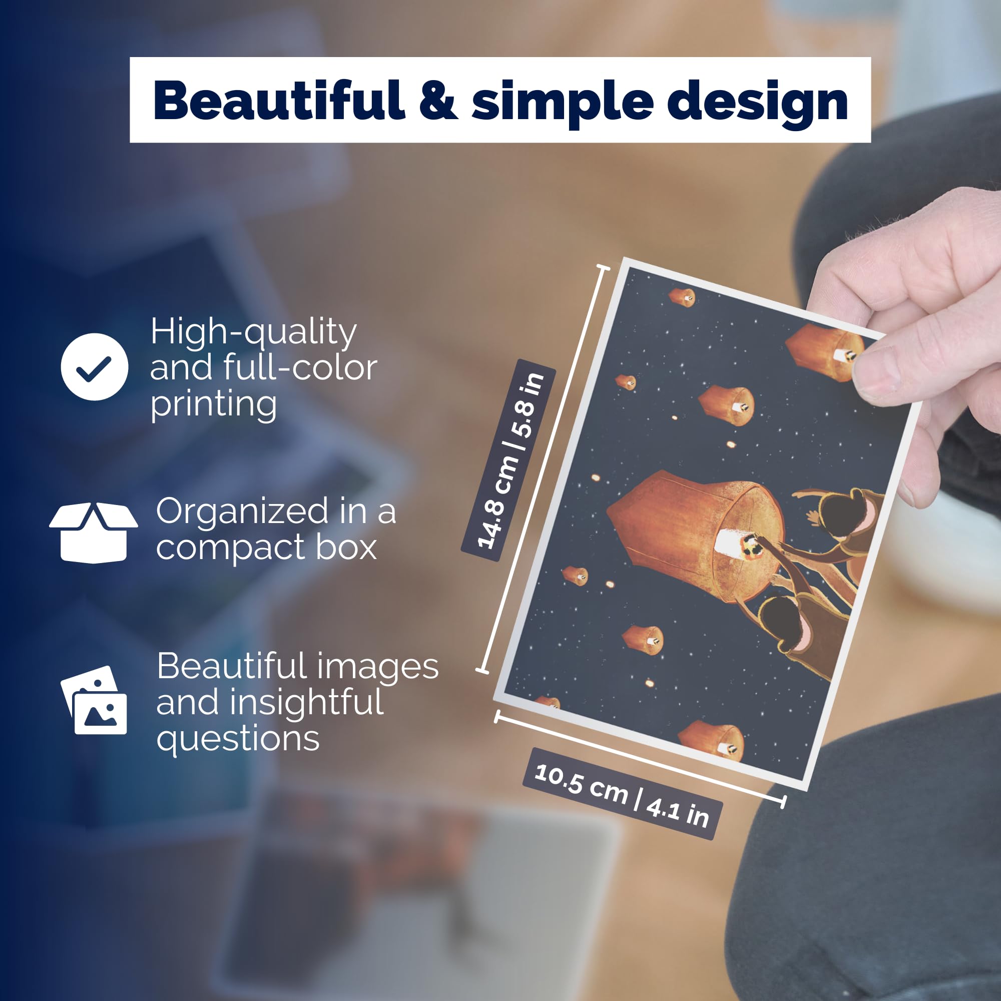 • Versatile Prompt Cards – The 52 illustration postcards with questions are essential tools for youth work, therapy sessions, coaching activities, self reflection card and as a card game for gatherings.