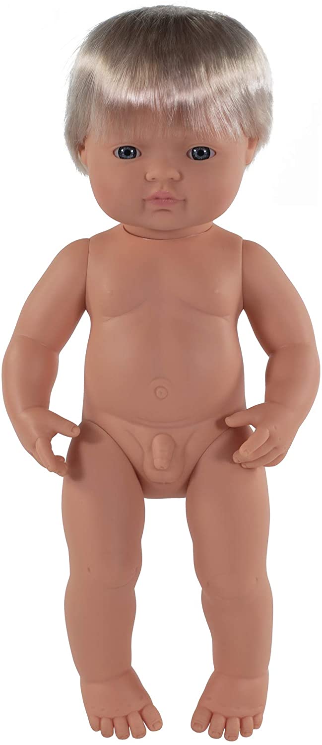 Miniland doll European boy without underwear is soft vinyl, resilient and flexible. It has articulated and lightly scented body. Anatomically correct. It is suitable for special needs. It measures 38 cm height.