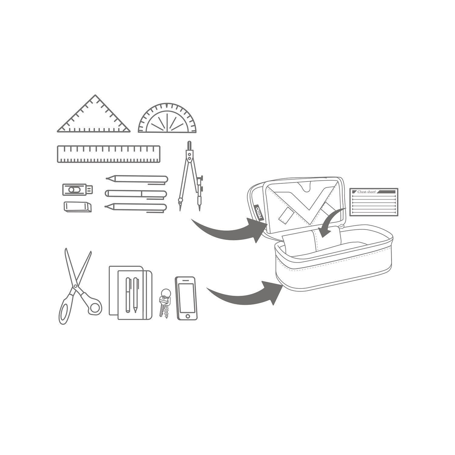 - Divider panel with room for a set square, timetable, eraser and pencil sharpener
