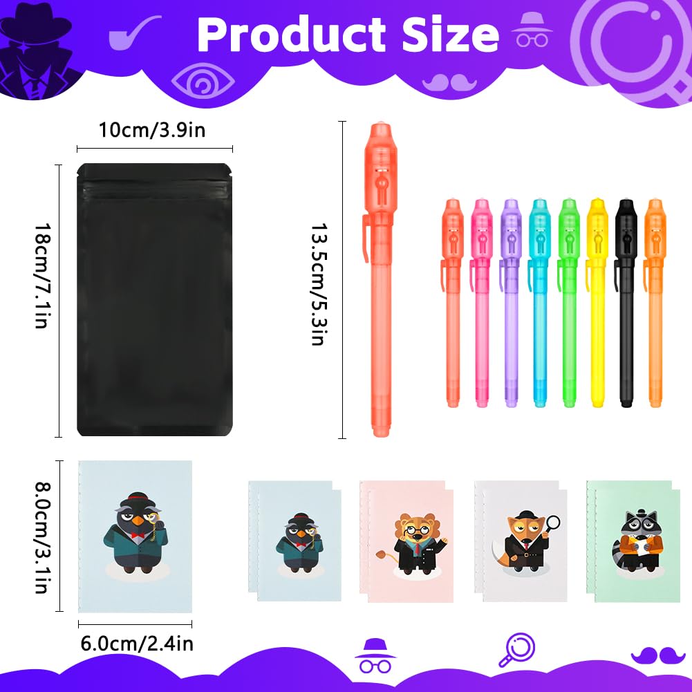 - Great Value Package Our top secret package includes , 32 UV invisible ink pens with built-in UV light, 32 detective notebooks and gift bag. 32 UV invisible ink pens with 8 different shell colors: black (x4), red (x4), purple (x4), green (x4), yellow (x4), pink (x4), blue (x4) and orange (x4). All transparent inks are the same color!