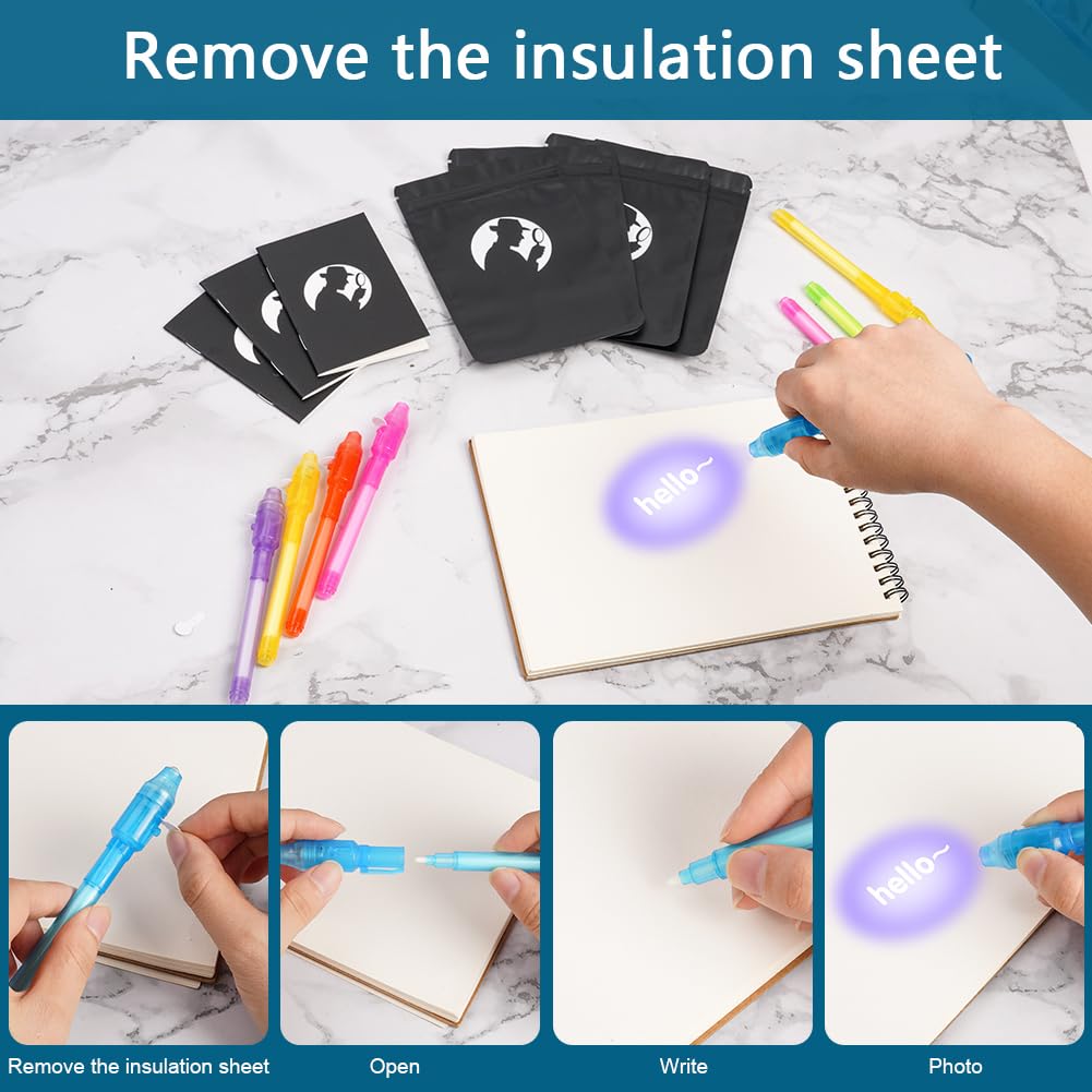 Once your secret message is written, wait a few seconds and the UV light covered by the pen can unveil the mystery of the secret message.