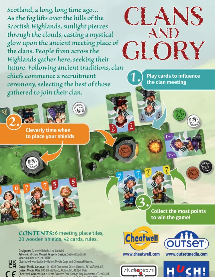 Clans And Glory is a strategic card game set in the Scottish Highlands, where players compete to recruit the best followers to their clan. Participate in an ancient ritual as you place cards and shields, using skilful planning and clever moves to assemble the strongest clan. Can you outwit your rivals and secure victory? Suits Ages 8+ 2-4 Players