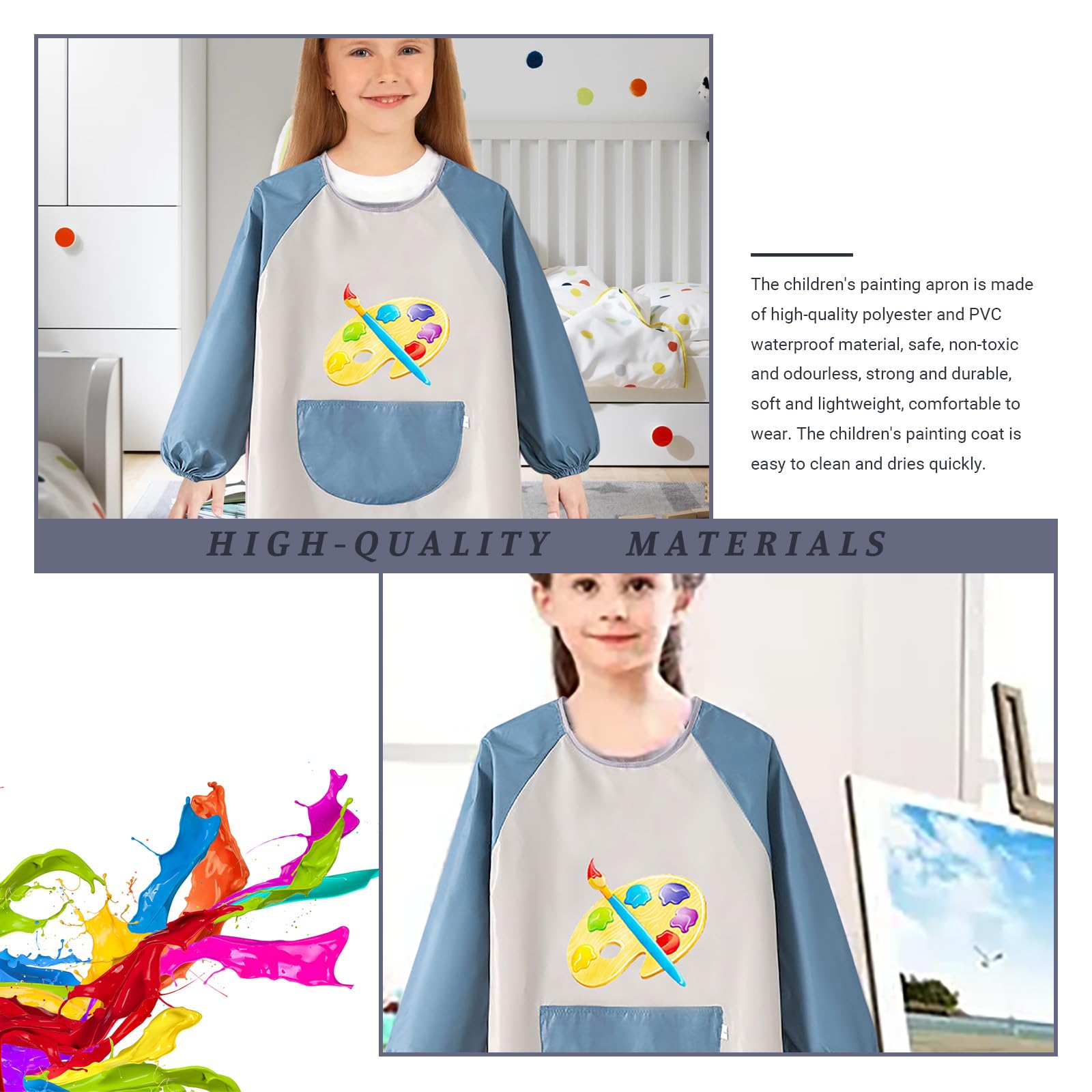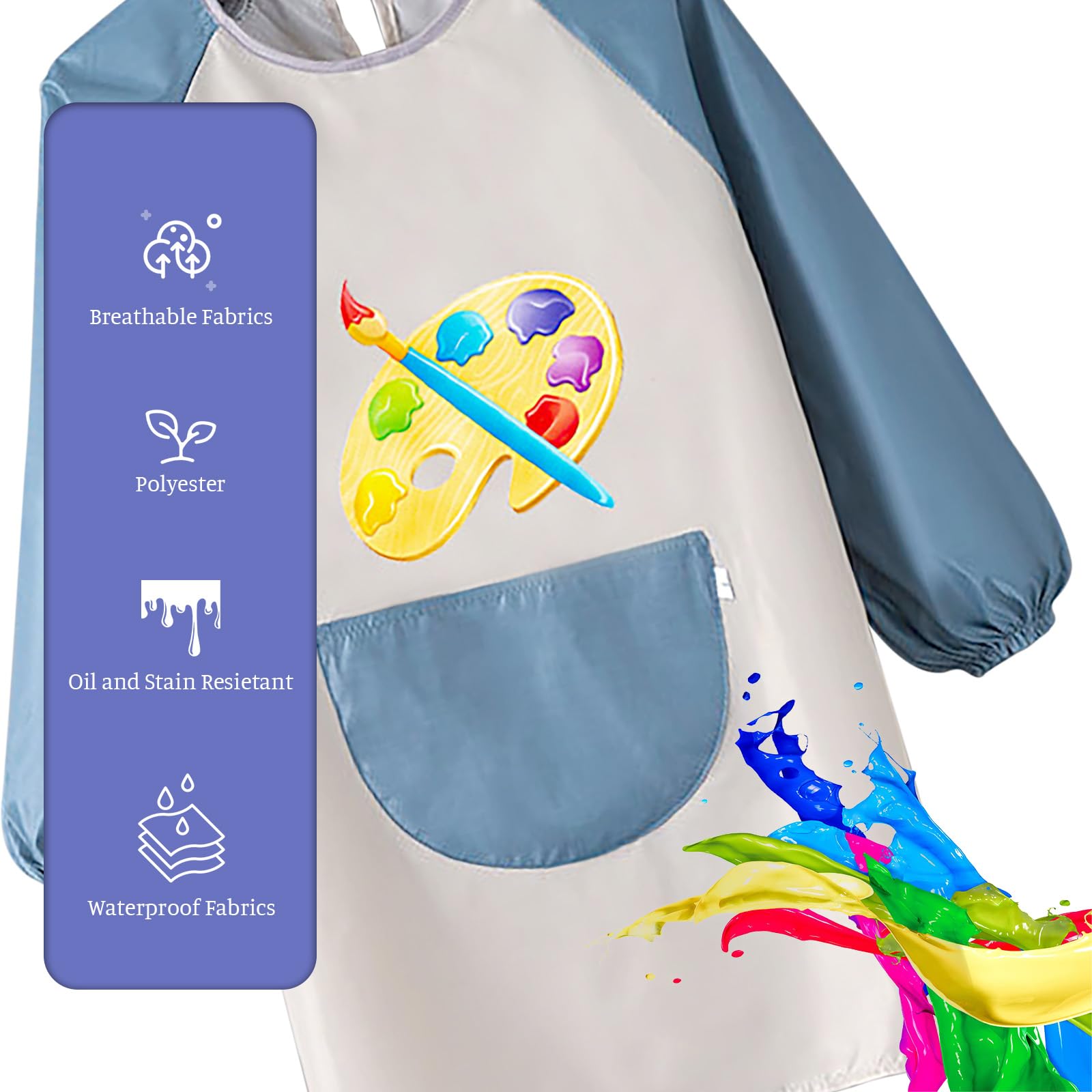 - Reasonable design Designed with elastic cuffs, our kids’ aprons offer better protection for your child’s clothes and arms, preventing color and dirt stains. The spacious front pocket provides convenient storage for painting tools or other items.