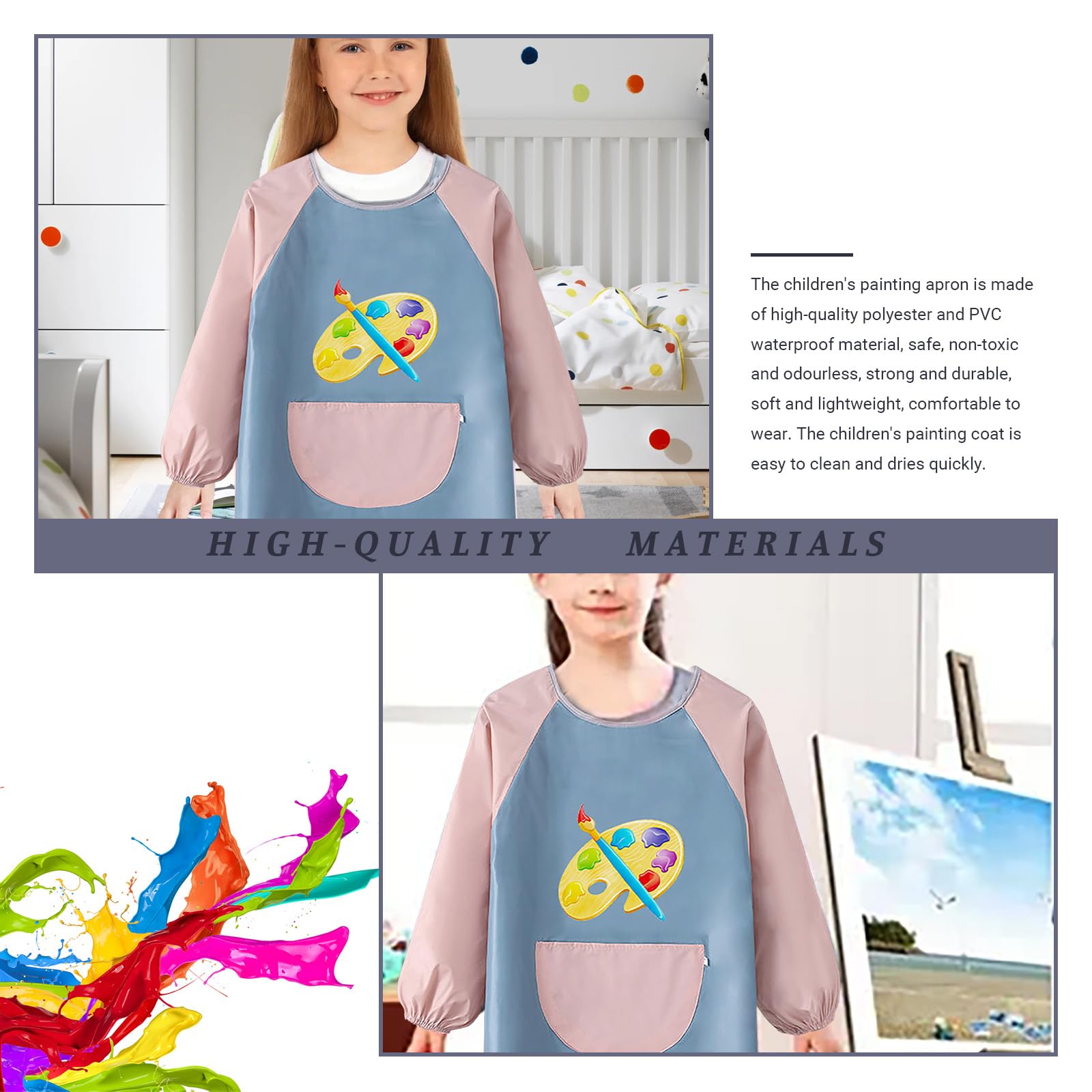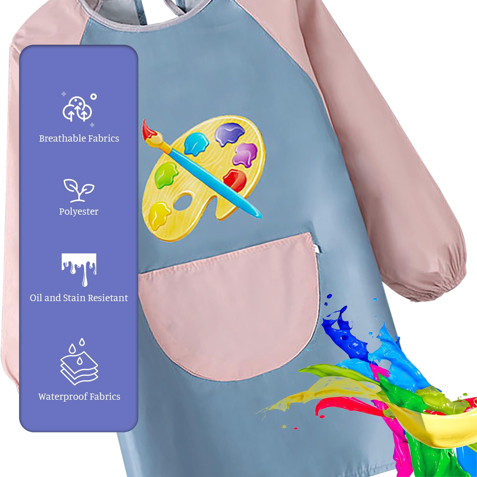 - Reasonable design Designed with elastic cuffs, our kids’ aprons offer better protection for your child’s clothes and arms, preventing color and dirt stains. The spacious front pocket provides convenient storage for painting tools or other items.