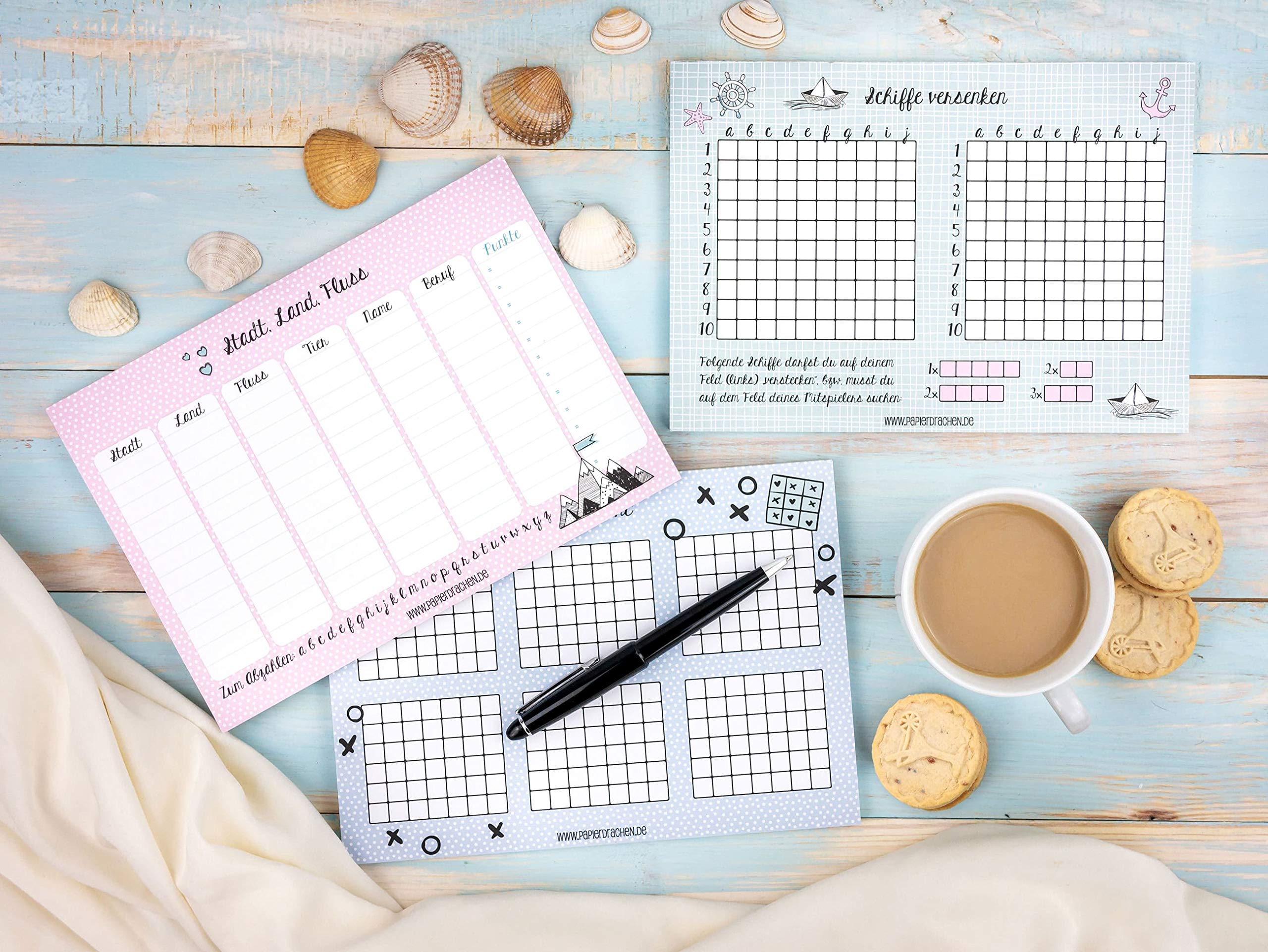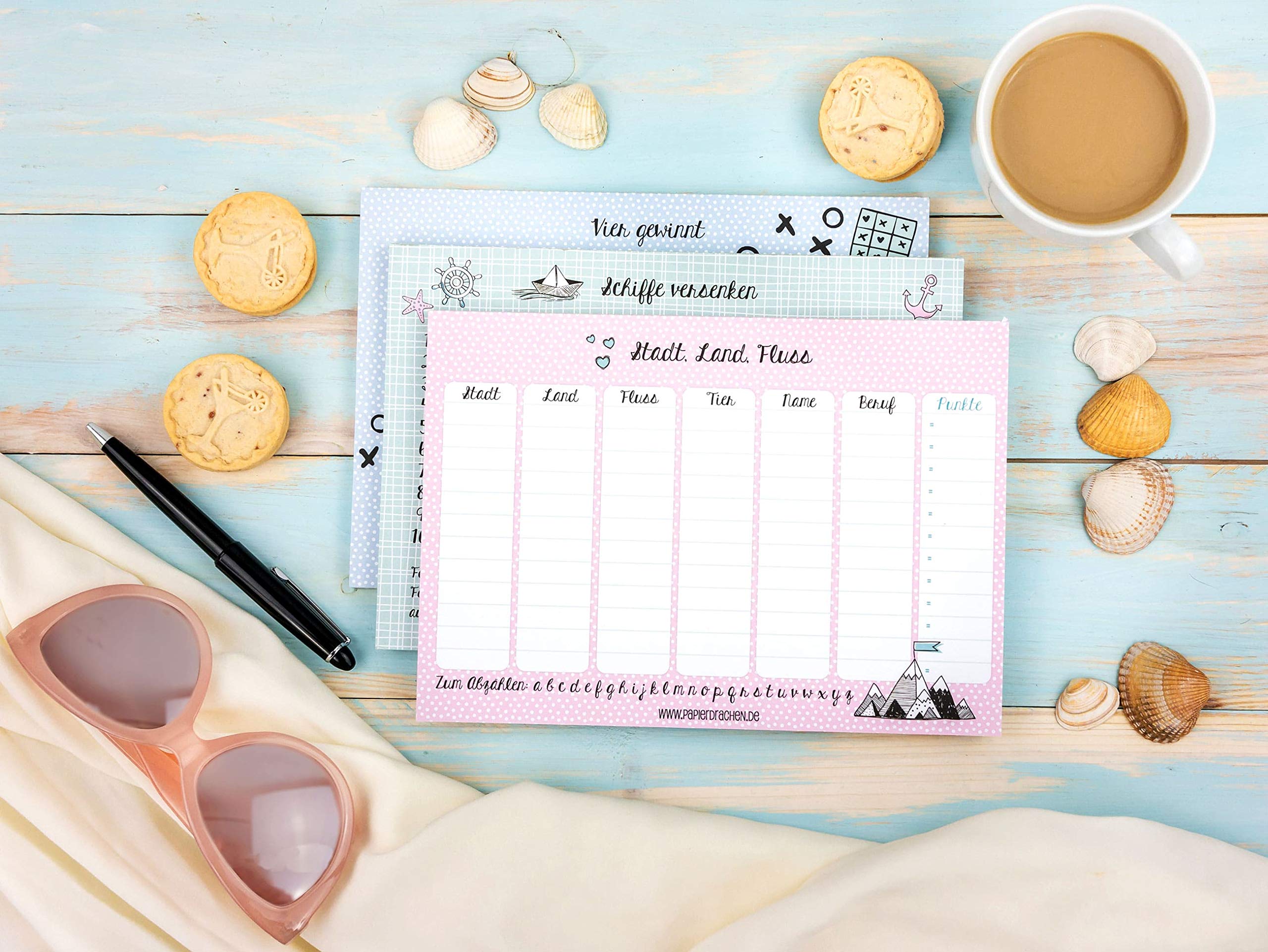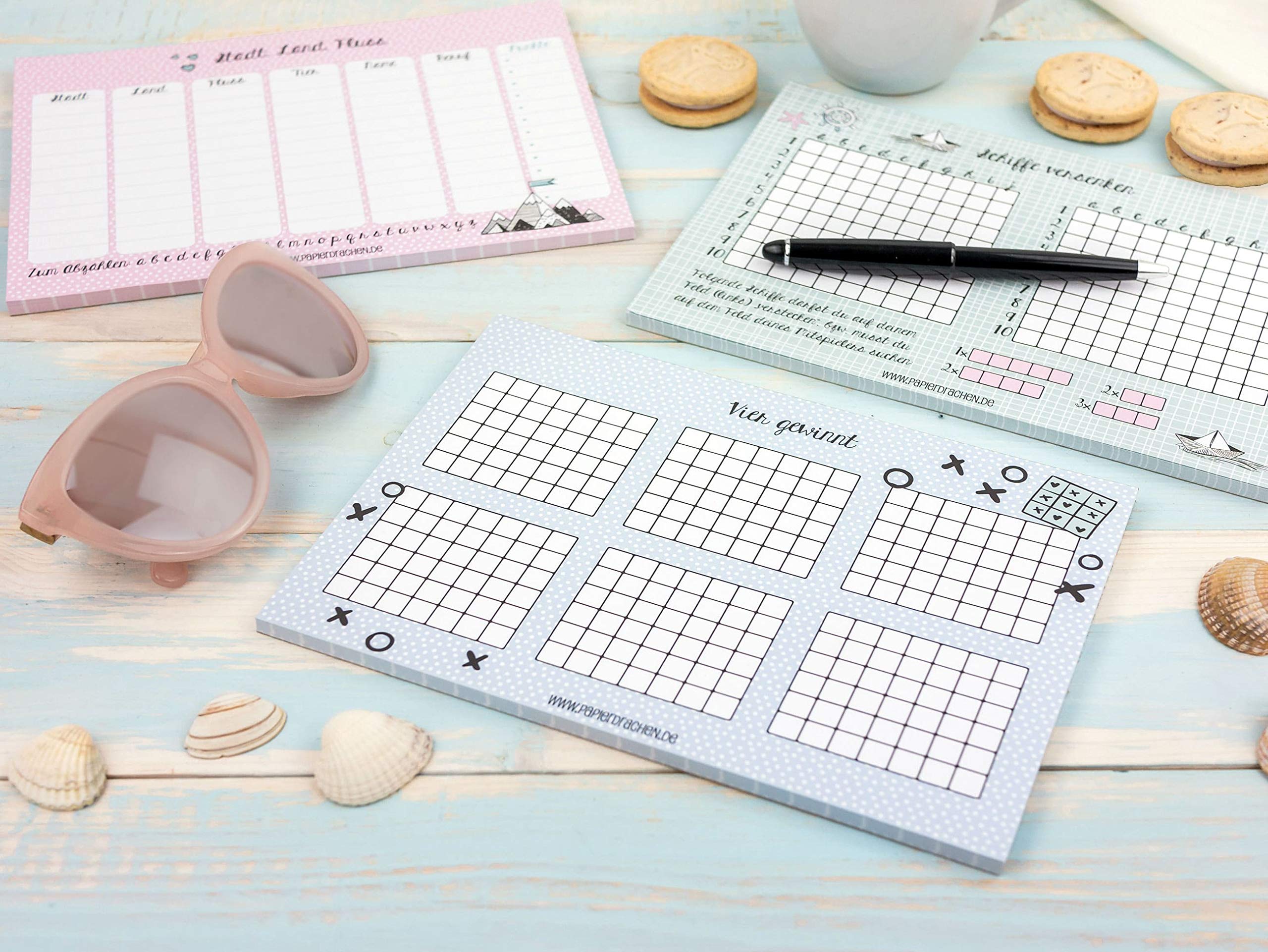 - Papierdrachen 3 DIN A5 tear-off pads with games: city country river, ships sinking, four wins – each 50 sheets (80 g/m paper) – set number 7 – travel game