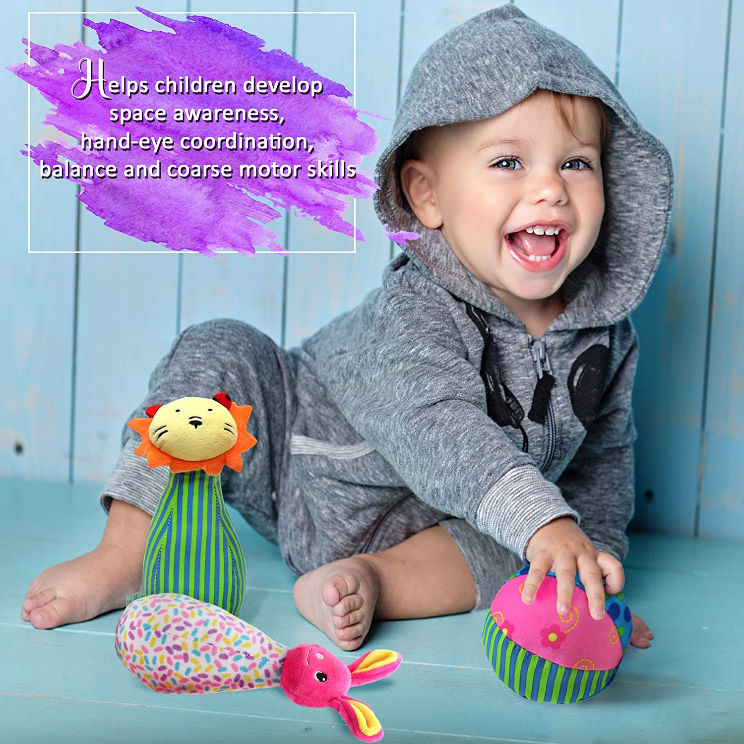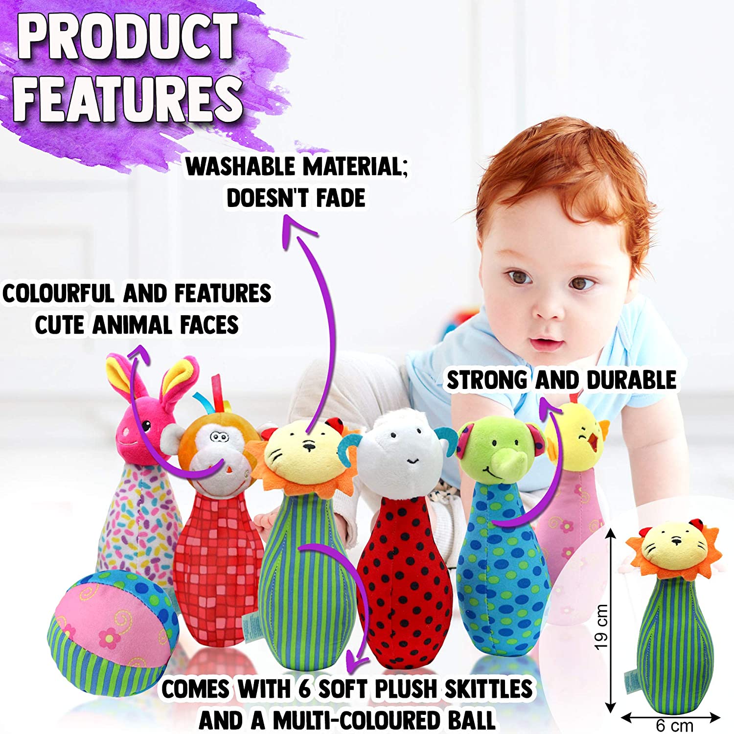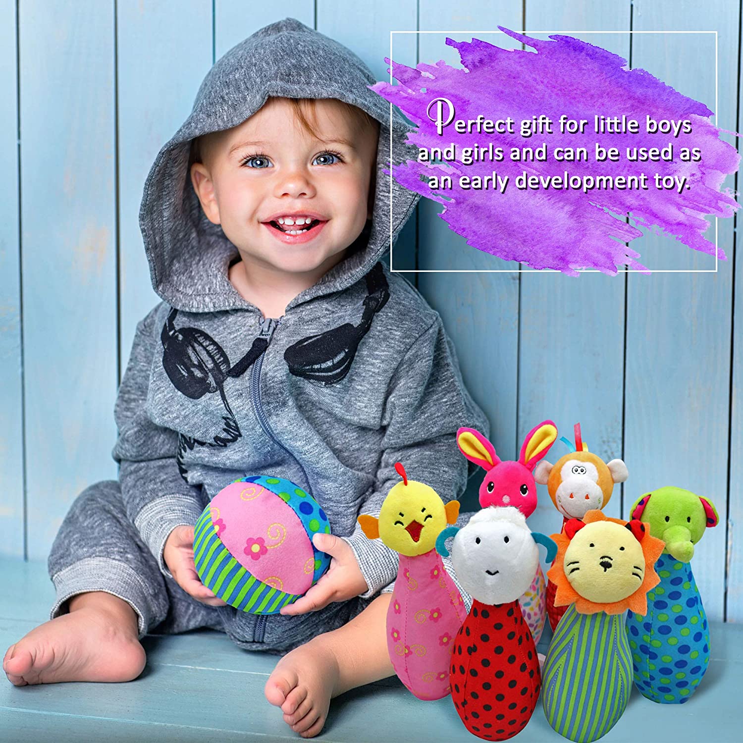 - ? CUTE AND CUDDLY – Our childrens bowling set are ideal for various ages – babies can enjoy their soft, cuddly touch, serving as plush animal toys, while toddlers will grasp the idea & purpose of the game, enjoying their success when hitting the skittles & watching them fall!