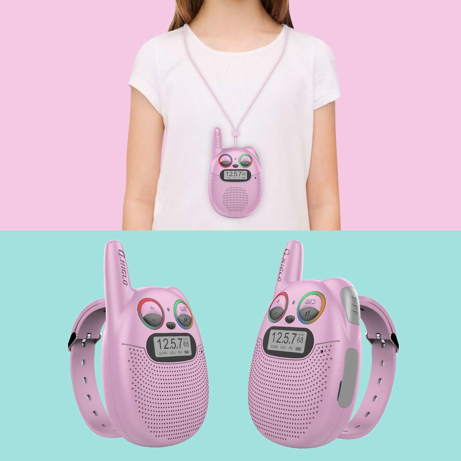QNIGLO Rechargeable Kids Walkie-Talkies with FM Radio, 2 Miles Range, Twinkling LED Eyes, Wearable Watch Walkies Talkies Toys for Kids Bicycling, Hiking, Camping, Running (Q136_Pink)