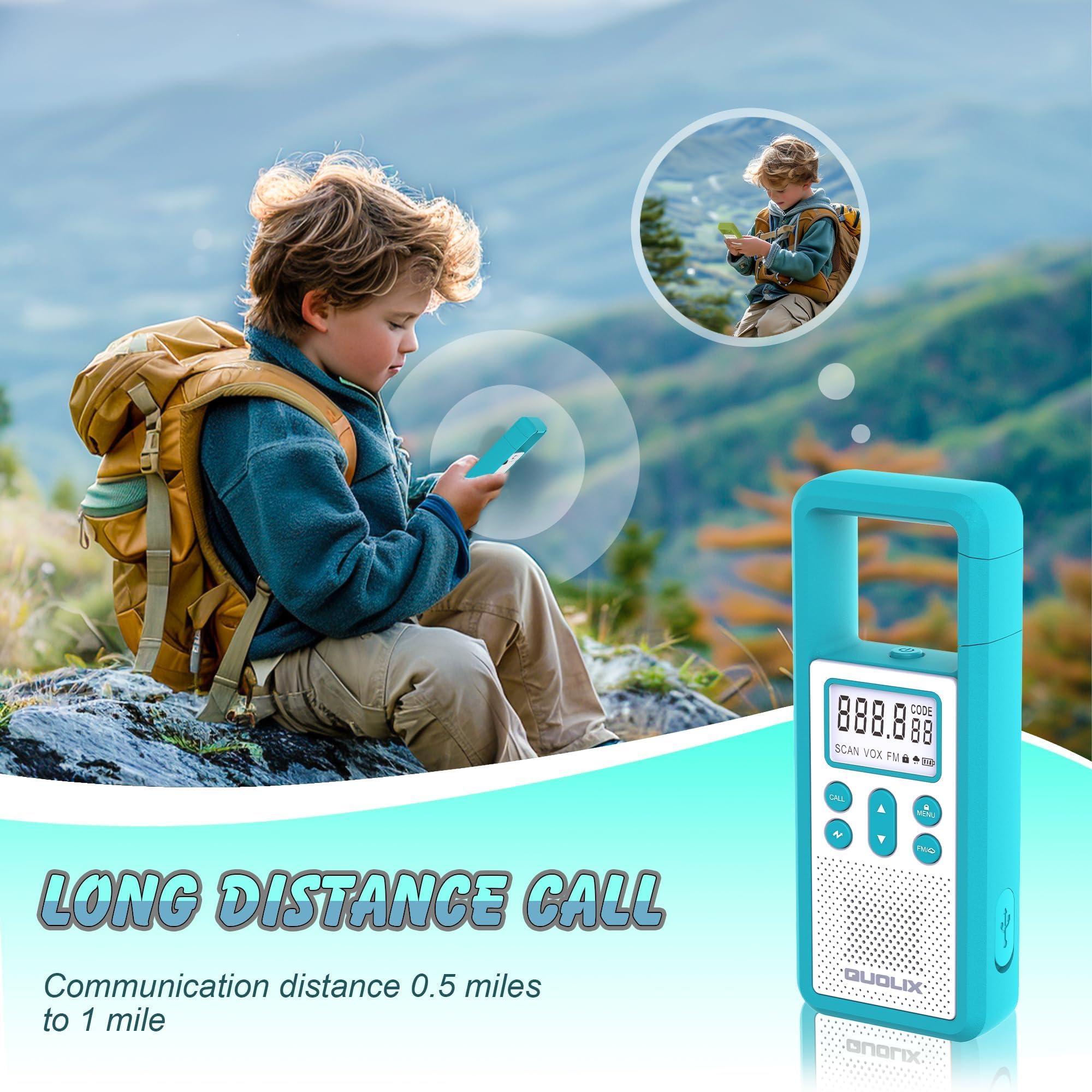 - Long Distance Walkie Talkies:QUOLIX rechargeable kids walkie talkies equipped with 8 channels and 99 codes, features auto channel scan, long distance communication, voice-activated (VOX), SOS alarm function, It is compatible with most PMR woki toki in the market, You can use it to keep in touch with your kids during outdoor activities, camping, hiking.