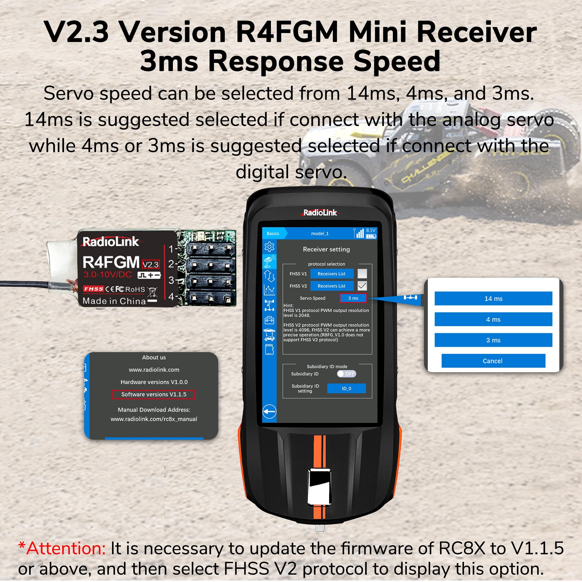 - Latest V2.3 Version Radiolink R4FGM Receiver- 3ms* Response, servo speed can be selected from 14ms, 4ms, and 3ms. 14ms is suggested selected if connect with the analog servo, while 4ms or 3ms is suggested selected if connect with the digital servo. (*Attention: It is necessary to update the firmware of RC8X to V1.1.5 or above, and then select FHSS V2 protocol to display this option)