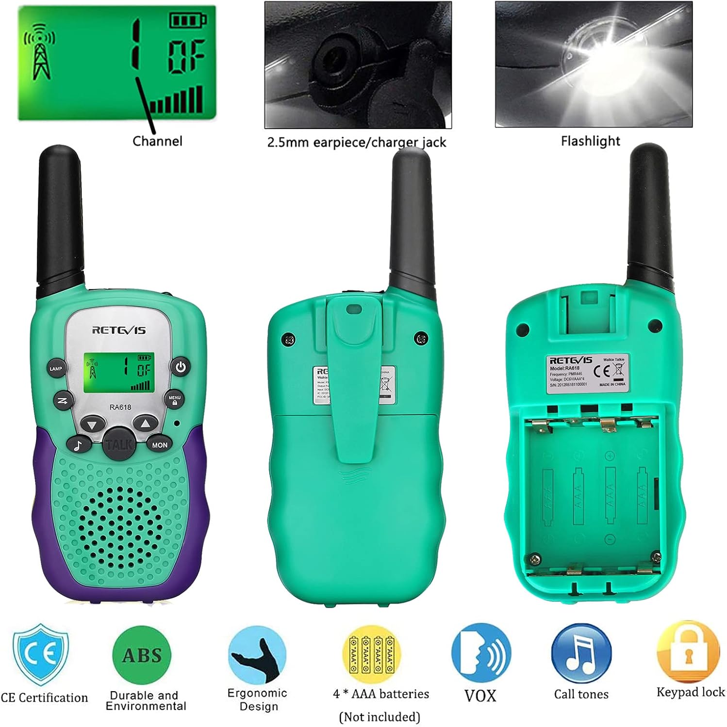 Retevis RA618 Walkie Talkies for Kids, Toy Gifts for 6-12 Years Old Boys Girls, 8 Channels VOX Flashlight, Walky Talky for Children Hide-and-Seek Camping Hiking Spring Outing (1 Pair,Green)