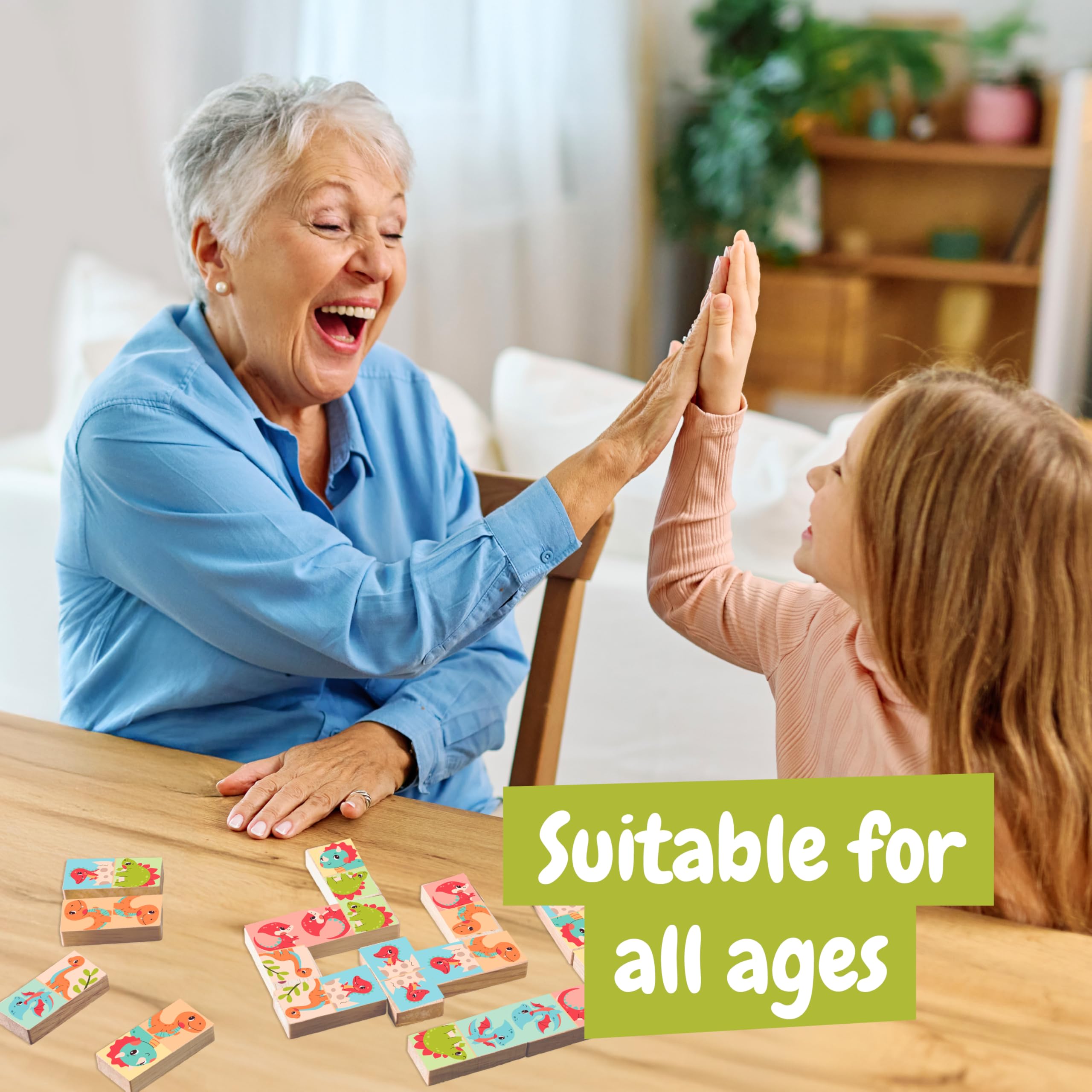 - [EDUCATIONAL LEARNING TOY] – Our wooden dominoes are suitable for children aged 2 and over. The wooden dinosaur dominoes and educational dominoes help children develop fine motor skills, early mathematical logic skills, colour cognition, and shape matching, enhance child’s concentration and imagination, and improve memory and hand-eye coordination.