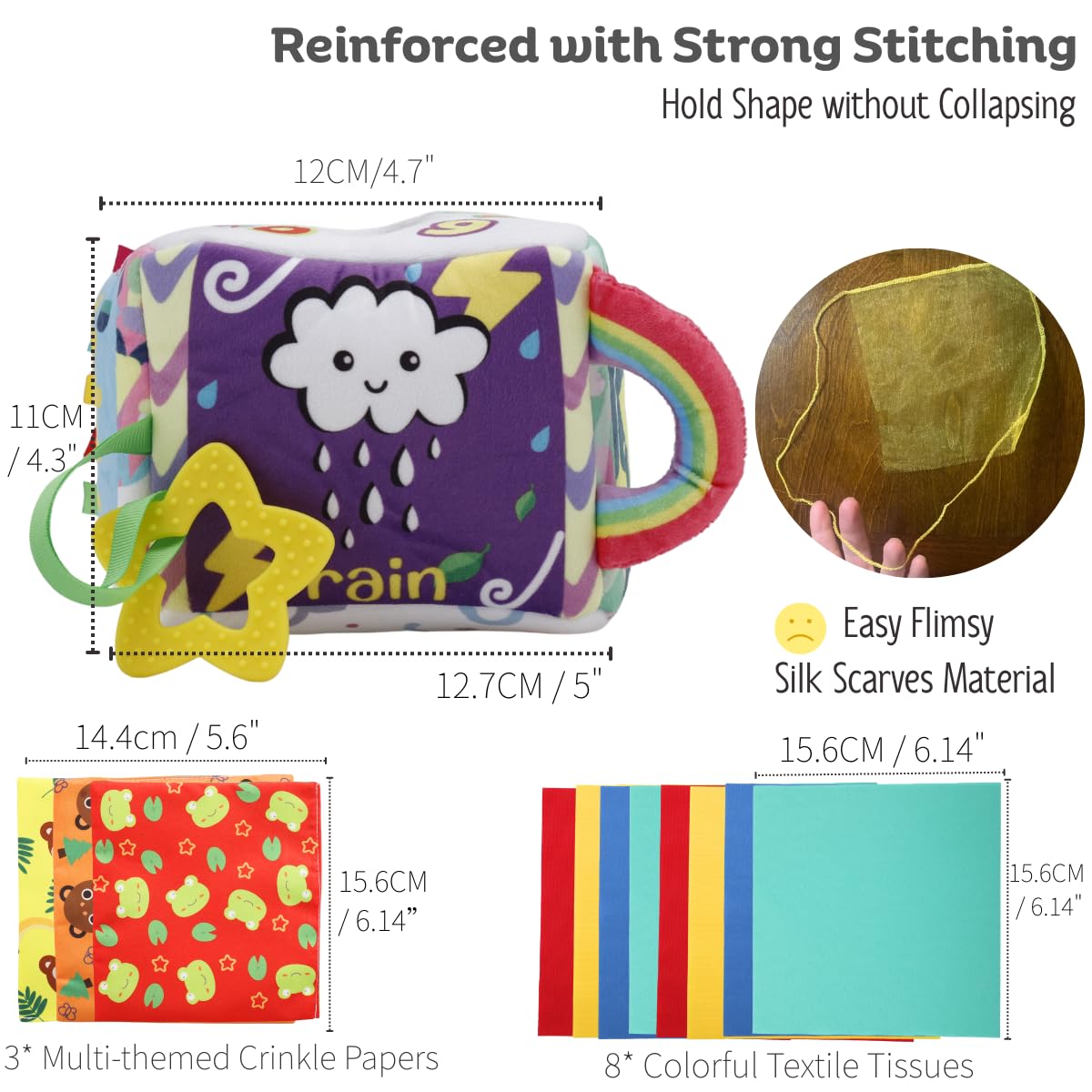 - Durable & Engaging Play Included Features 8 rip-proof textile tissues (not flimsy silk scarves) and 3 crinkly sounding papers for lasting, skin-friendly and safe fun. This sensory tissue box baby toy encourages fine motor skills through endless pulling and exploring. Grab kids attention with its bright colors and crinkly sounds.