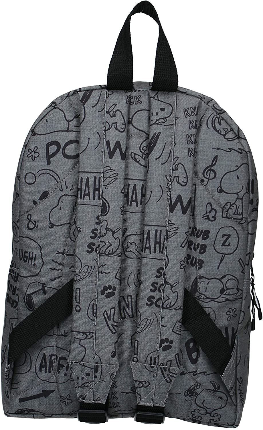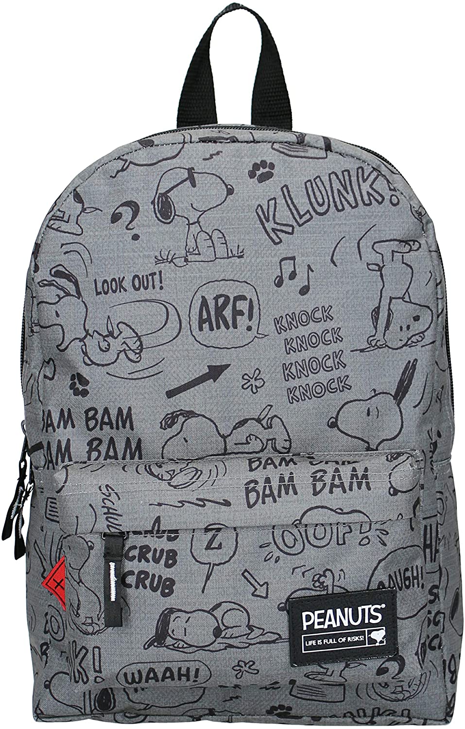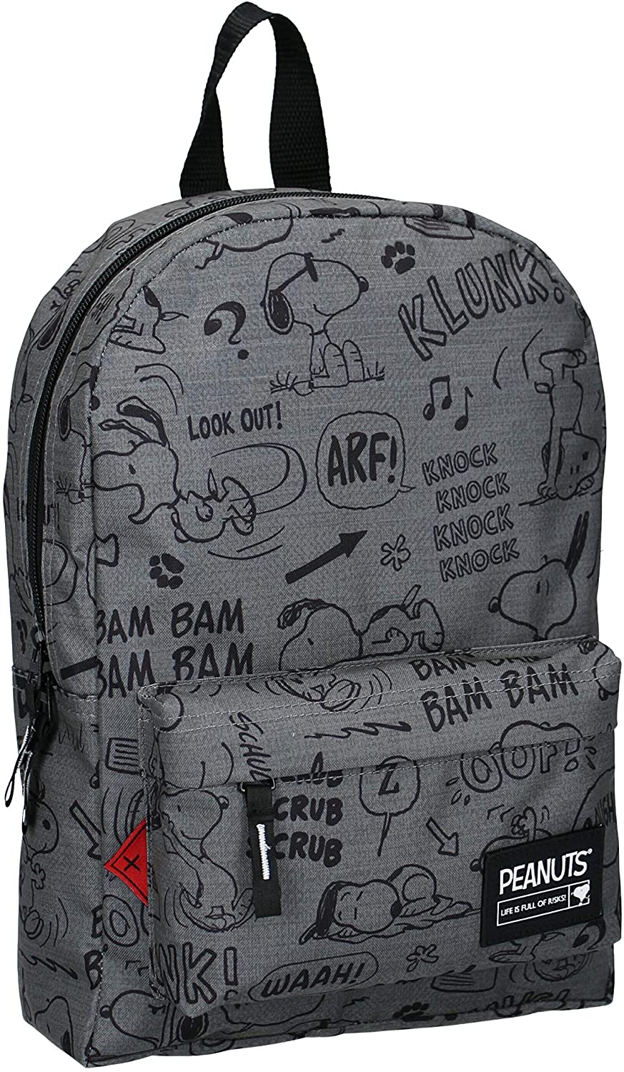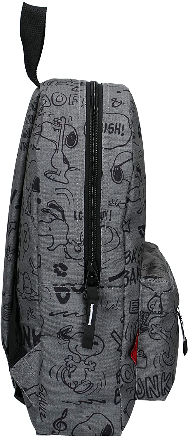This gray backpack from Snoopy is ideal for a day out or to take to school. The backpack has a large front pocket and a smaller front pocket, both resealable with a zipper. All sorts of statements and images of Snoopy are depicted on the backpack. The shoulder straps are adjustable for extra comfort.
