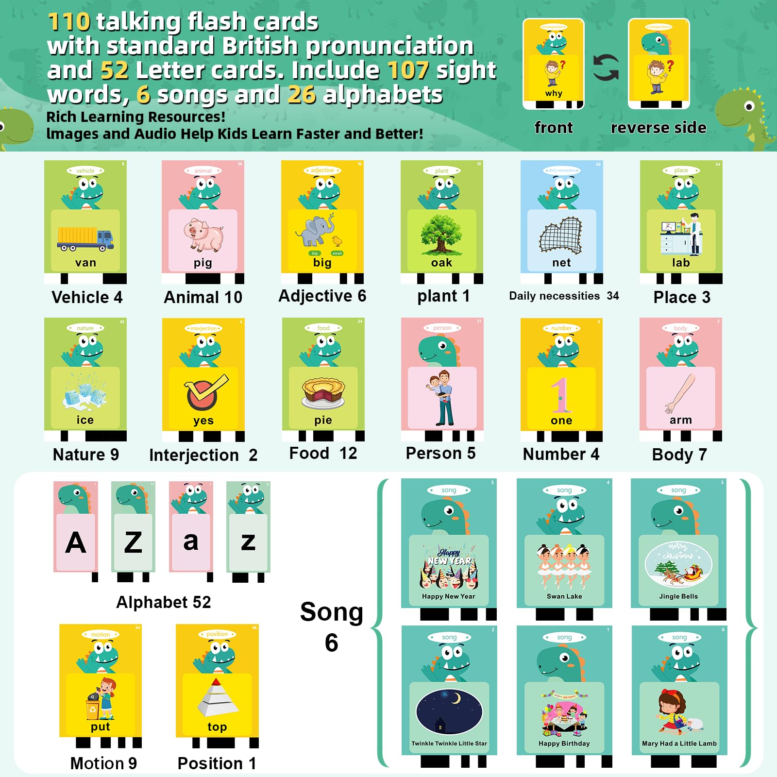 Talking & Singing Educational Toy: 110 talking flash cards with standard British pronunciation and 52 Letter cards. Include 107 sight words, 6 songs and 26 alphabets. Animals and transportation with vivid sounds. Fun CVC word learning Montessori toy for 3+ years old kids, improve their language, speaking, listening comprehension and music perception abilities.Animal and vehicle flash cards can make corresponding sounds.