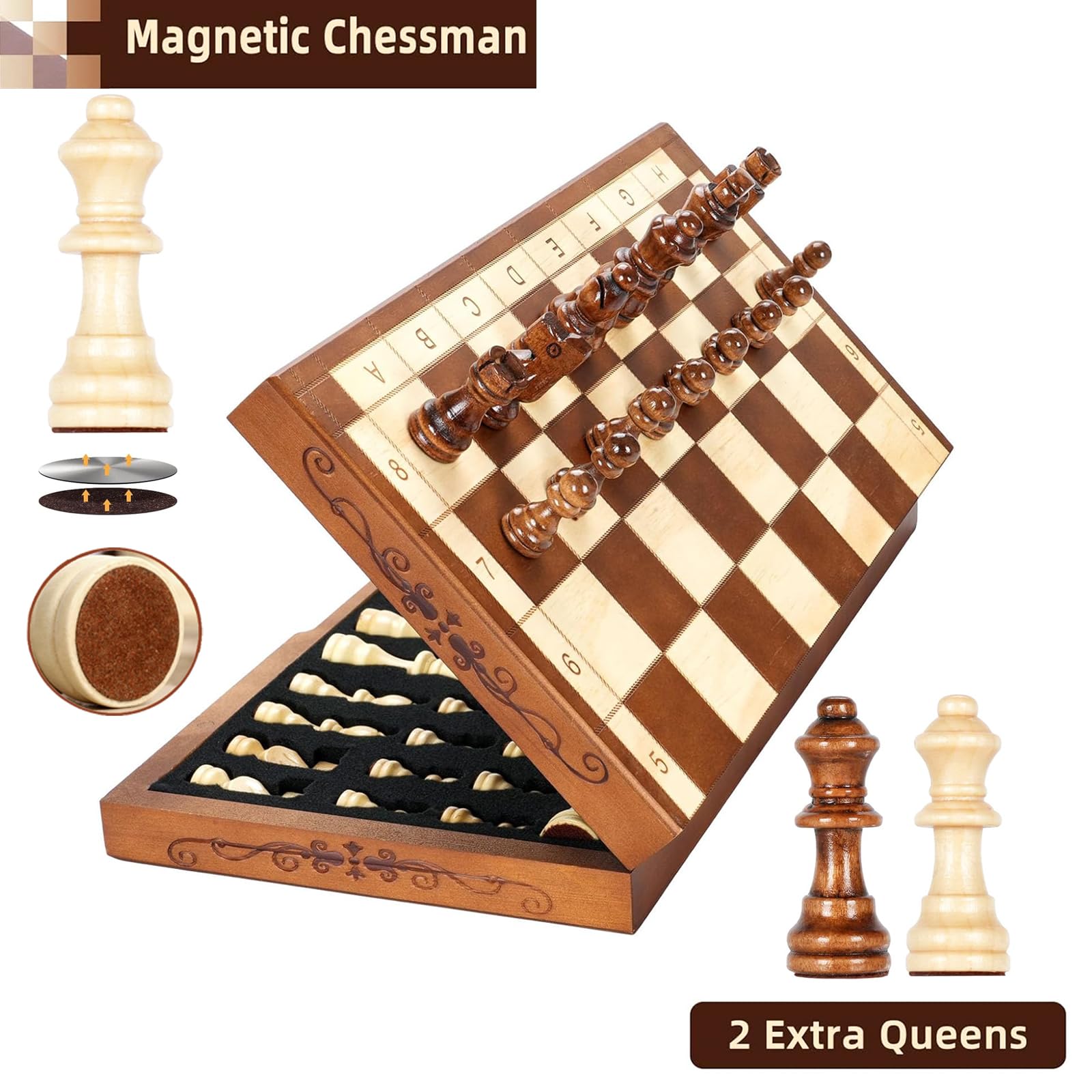 - BUILT-IN STORAGE COMPARTMENTS: Magnetic Chess Board with Storage Slots for Chess Pieces, all pieces can be placed conveniently into their own places so you will never miss them again.