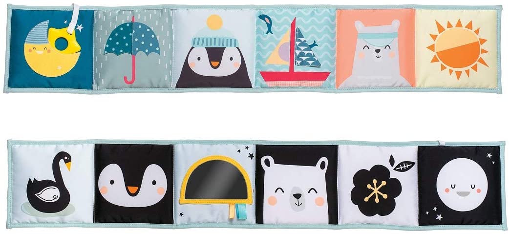 This beautifully illustrated and crinkle filled activity book is perfect for baby from a very young age. With two developmental stages the high contrast side of the book can be used for the first few months of life to help develop baby’s senses and emotional intelligence whilst the other side helps enhance fine motor skills with the use of a handy star shaped teether with moon pouch, peek a boo umbrella and crinkling sail once baby passes the three month mark. Once baby develops their core stability this is a perfect aid to encourage tummy time. Easily foldable, the North Pole Activity Book is great to take out and about, and can be easily attached to the cot or the pram using the baby safe ties provided.