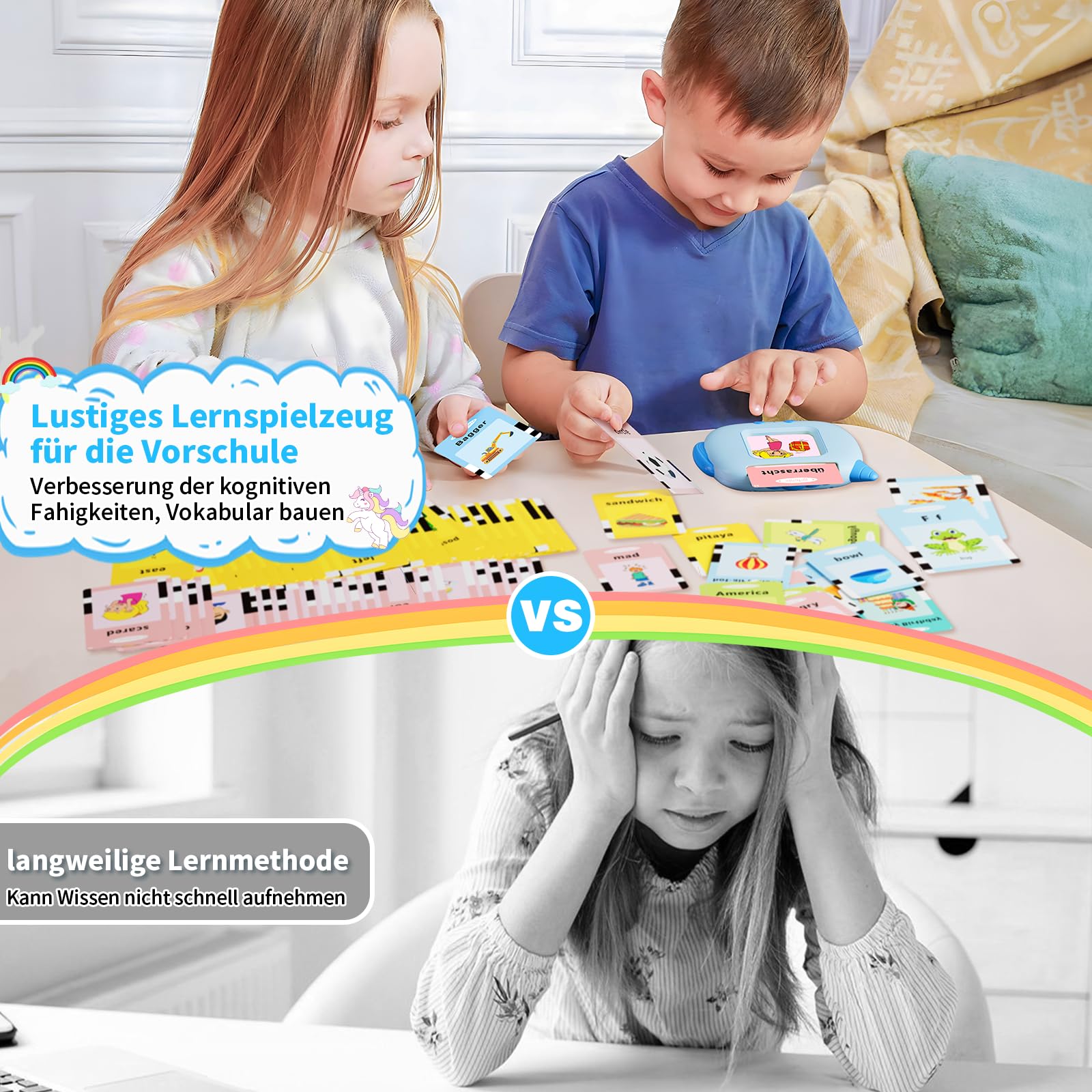 - Educational Talking Flash CardsSuitable for kids aged 2-6, this learning toy helps children deeply learn and understand words, makes the process of memorizing words more interesting than traditional learning model. kids can easily learn words and deepen the impression of words. It’s a helpful interactive machine that enhances kids’ cognitive ability and exercises their hearing