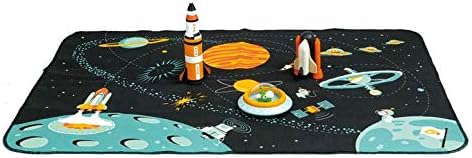 - SPACE THEMED TOY A spectacular galaxy themed play mat to go on a space adventure. Includes a solid wood flying saucer with a little green alien encased in an acrylic dome, a space shuttle, and an Apollo rocket in 3 parts.
