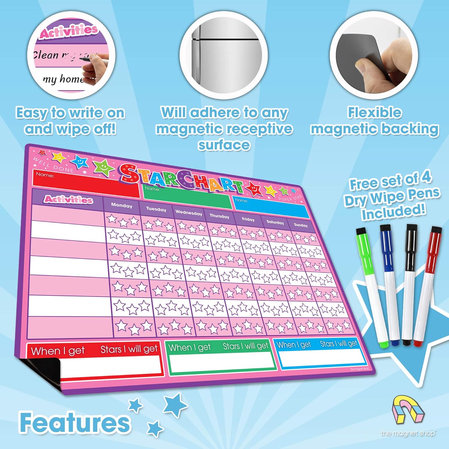The Magnet Shop Reward Chart for Children – Magnetic Star Chart for Recognising and Inspiring Good Behaviour in Toddlers and Kids, Boys and Girls. Comes with 4 Magnetic Coloured Dry Wipe Pens! (Pink)
